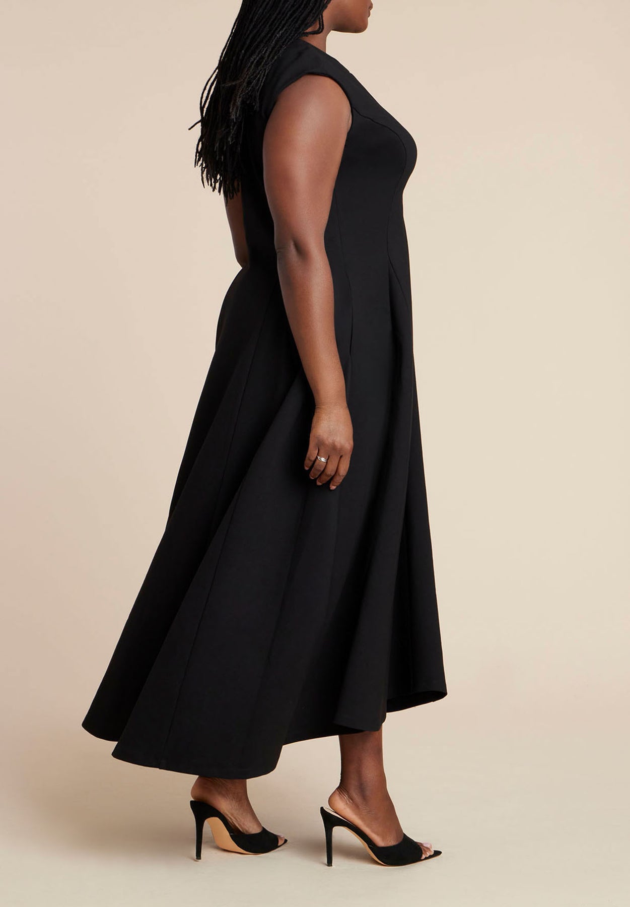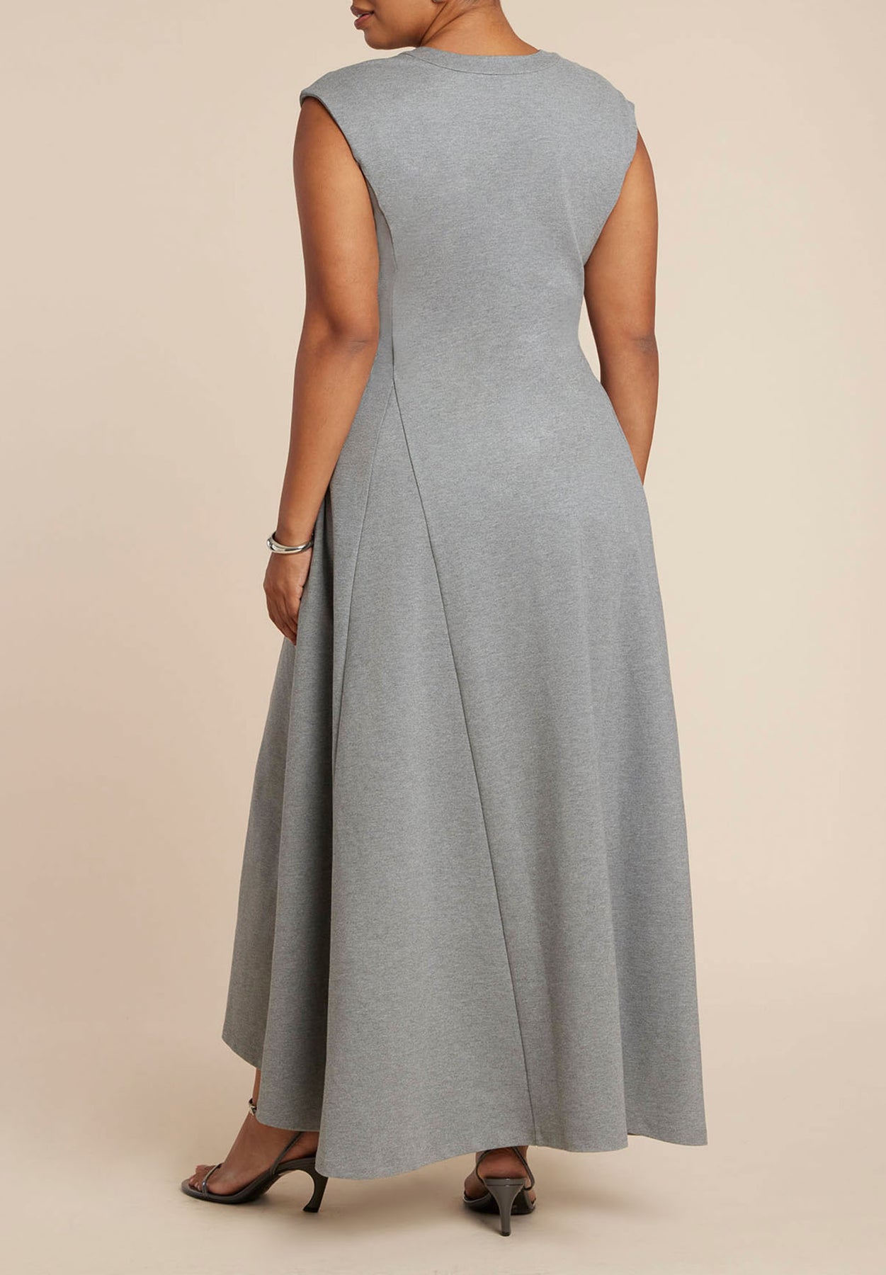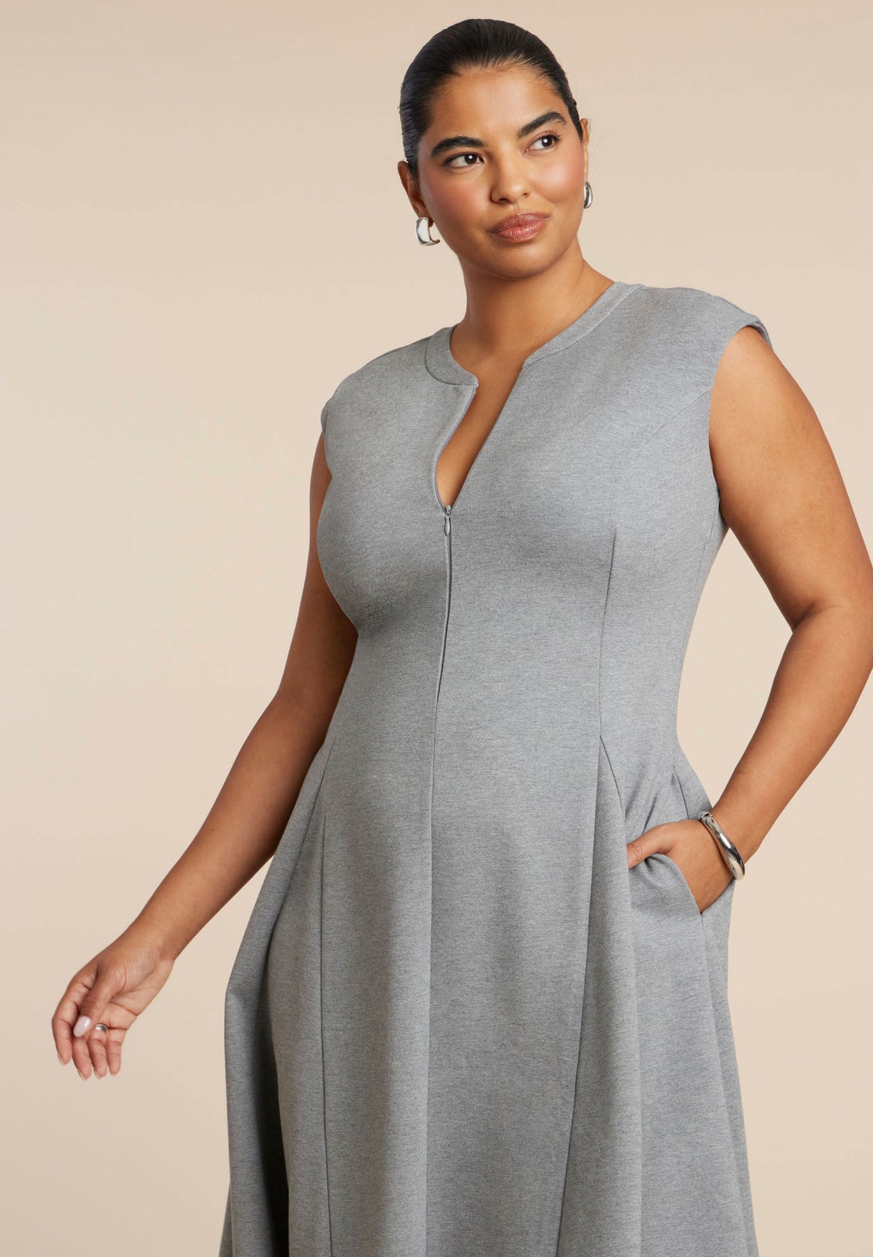 Command attention in this ponte maxi dress accented by sharp notch-seam detailing. A front zipper neckline and fluid hemline bring modern edge to a streamlined silhouette.
