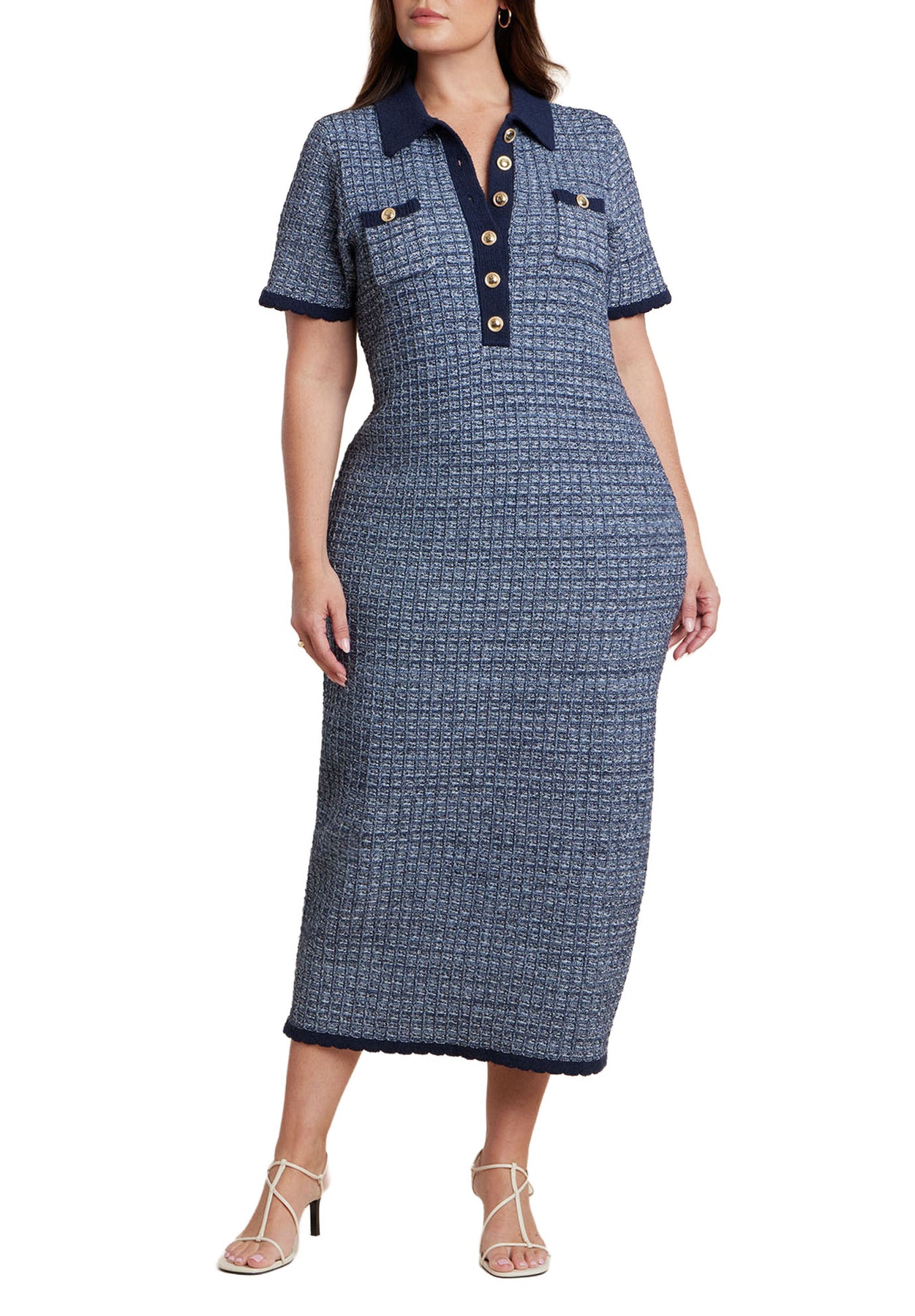 Refresh knit dressing with this sweater midi dress, crafted in tweed-inspired waffle stitching. A shirt collar and button-front accents lend subtle Parisian polish.