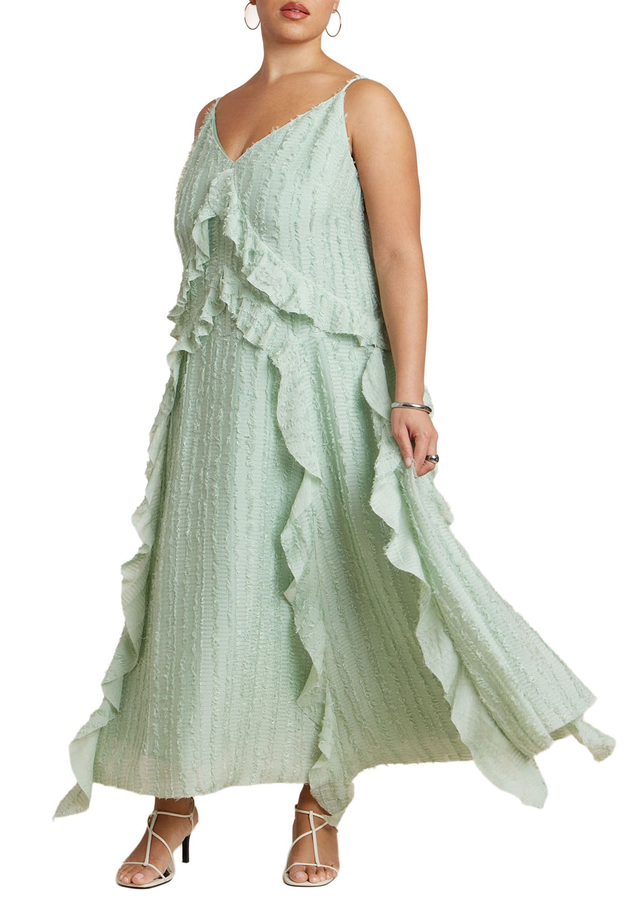Bring subtle texture to evening dressing with this ruffled maxi dress cut for clean lines. Adjustable cami straps and a softly flared skirt create modern, effortless appeal.