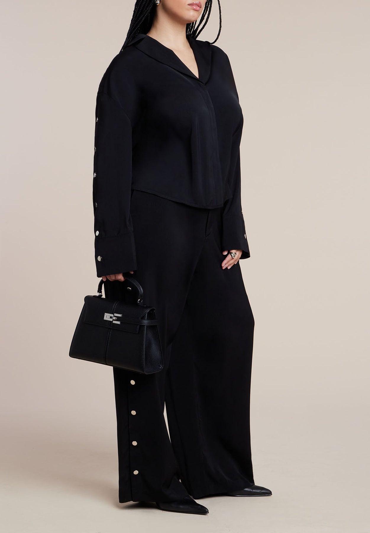 Elevate tailored dressing with these wide leg trousers finished with snap detailing along the sides. A high rise and clean drape bring sharp, confident polish.