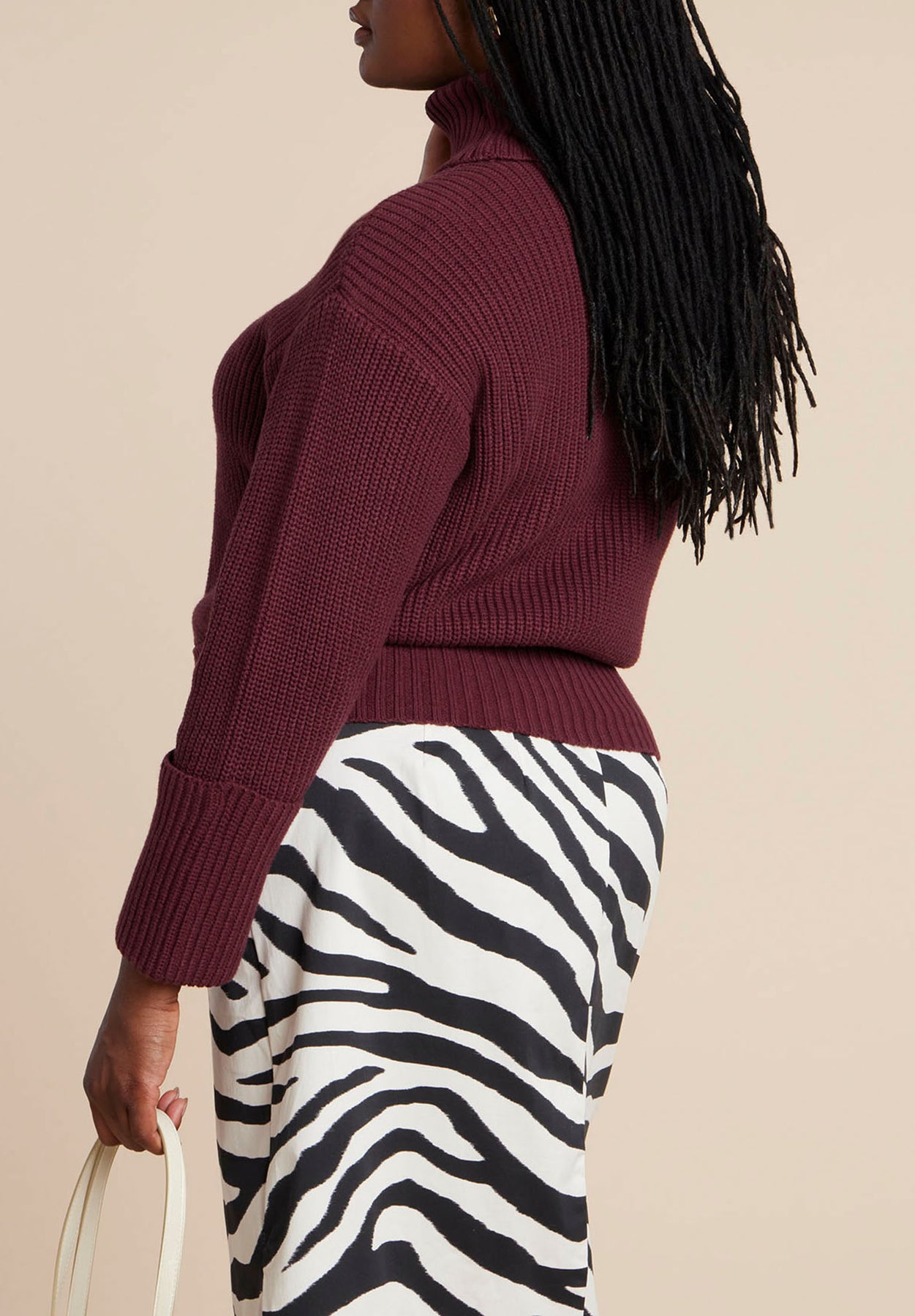 Wrap yourself in comfort and style with this ribbed turtleneck sweater featuring wide folded cuffs and a figure-cinching hem. Dropped shoulders and a high-hip length create easy, effortless proportions.