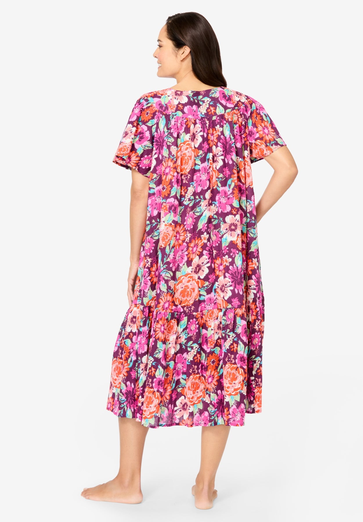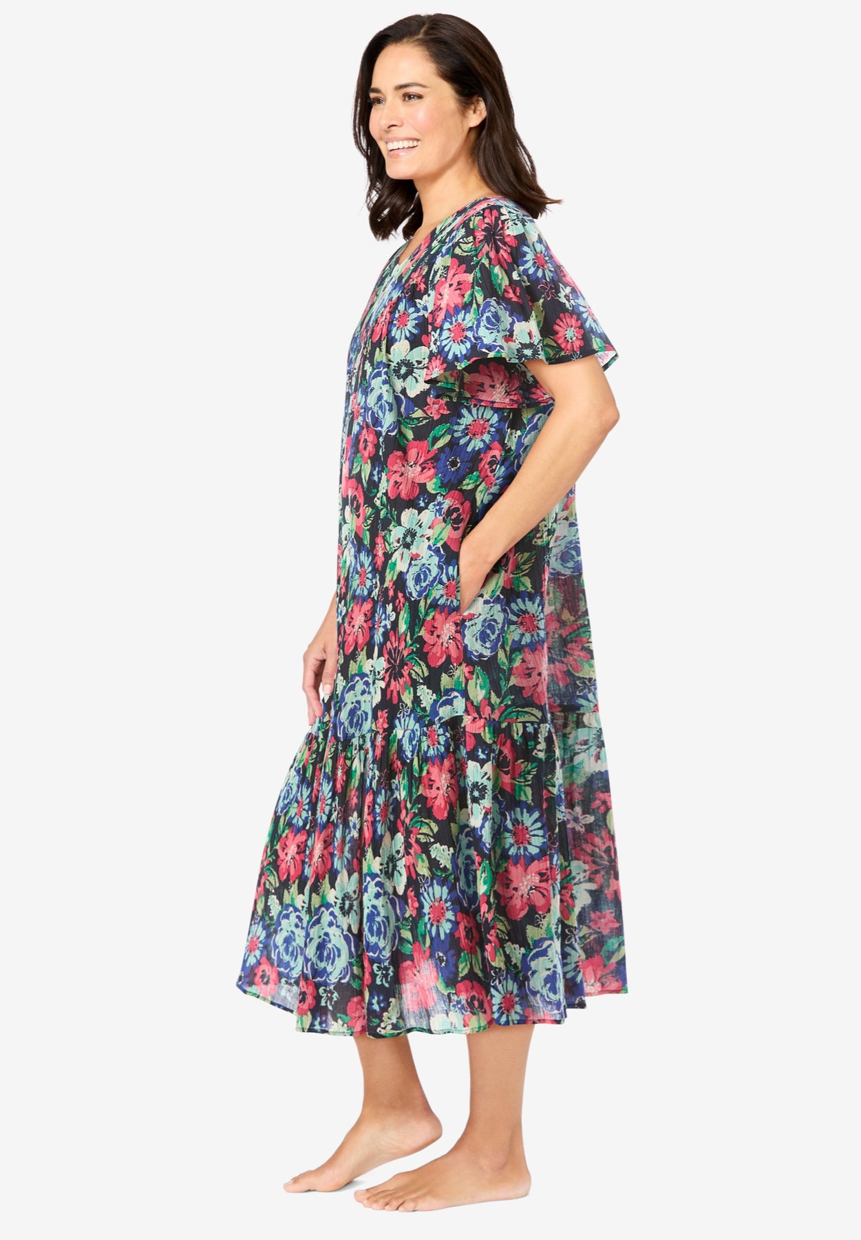 Lounge around in this airy Gauze Lounger. Relaxed v-neckline with neck shirring. Elbow length raglan sleeves and tiered bottom. Side pockets to carry your essentials.