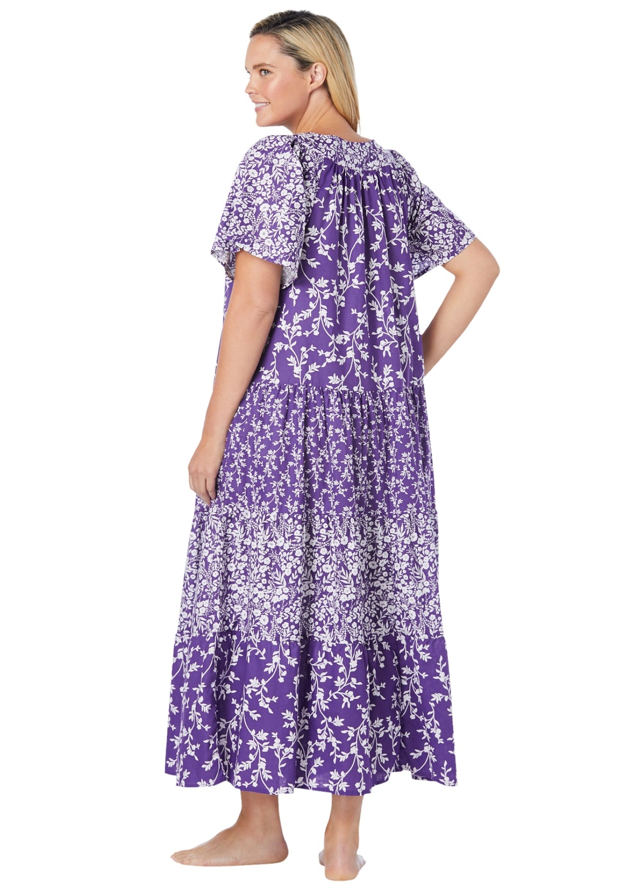 Gathered tiers create a full skirt in this pretty lounger, made from lightweight cotton that's perfect for relaxing or sleeping. Flutter sleeves and a V-neck add to the pretty details that are oh-so feminine.