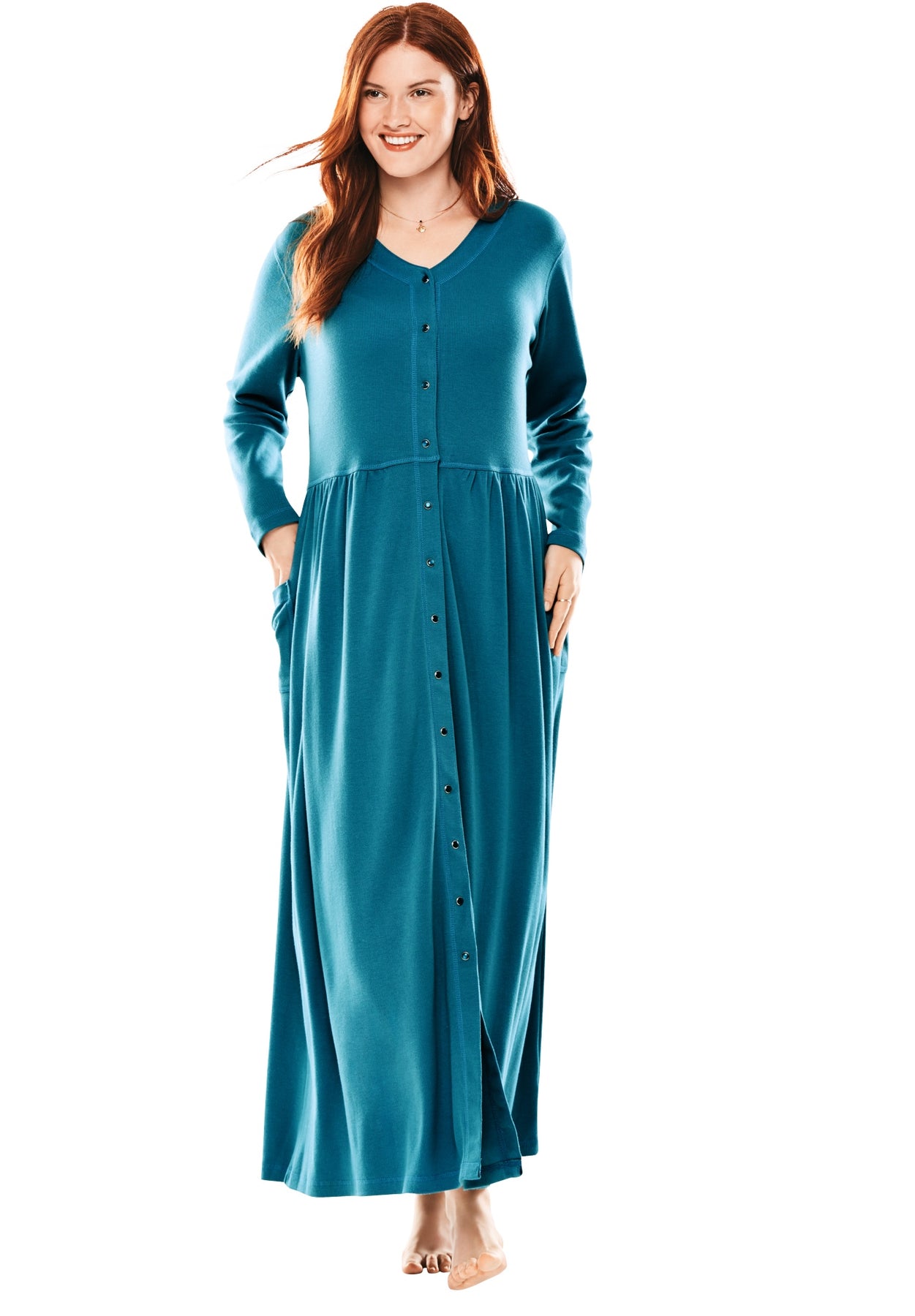 This extra long lounger is made from a soft and comfy knit that feels amazing when draped on the body. Long sleeves and a full sweep keep you nicely covered, and a full snap front allows you to wear it open or closed. Throw this lovely piece on when you're ready to kick back and relax.