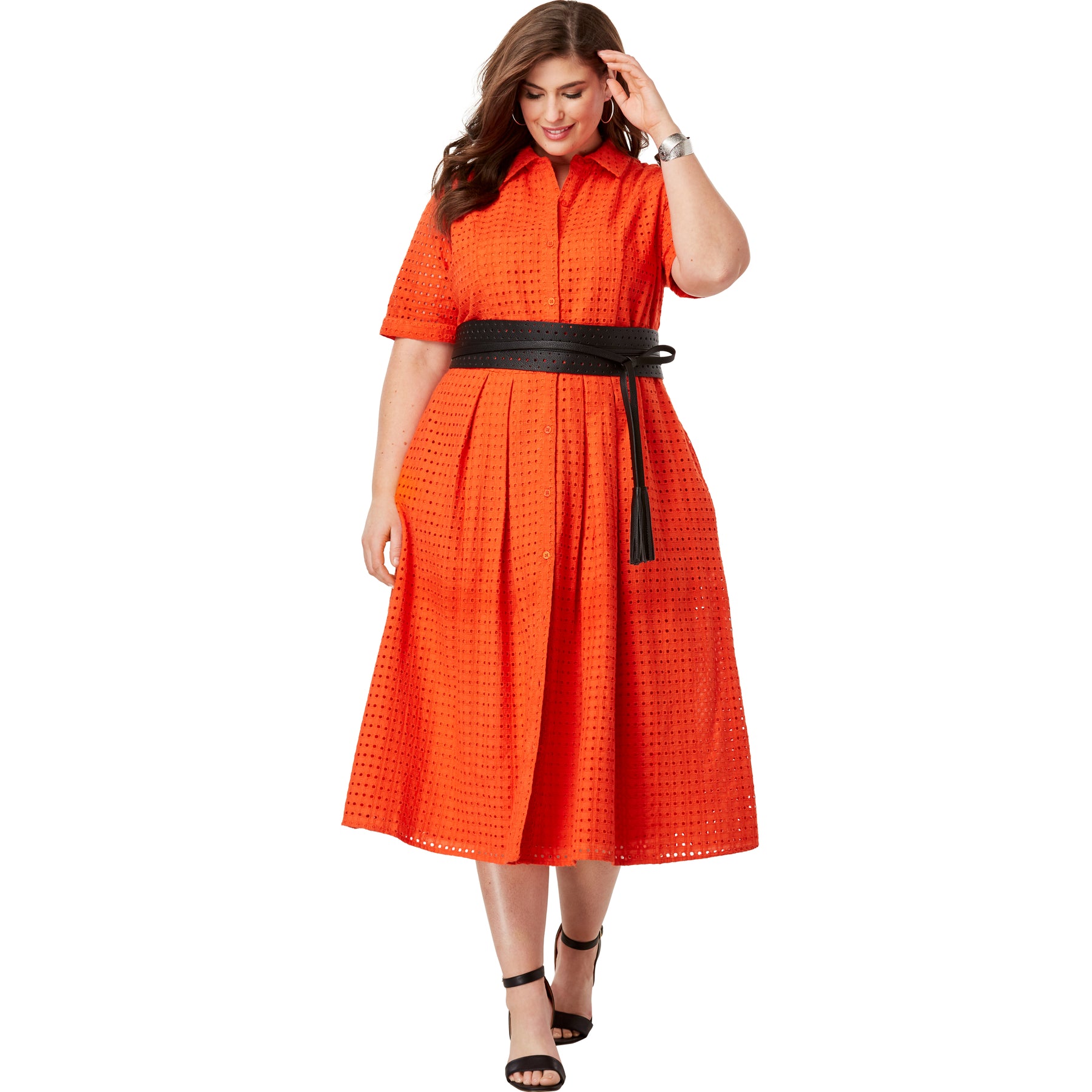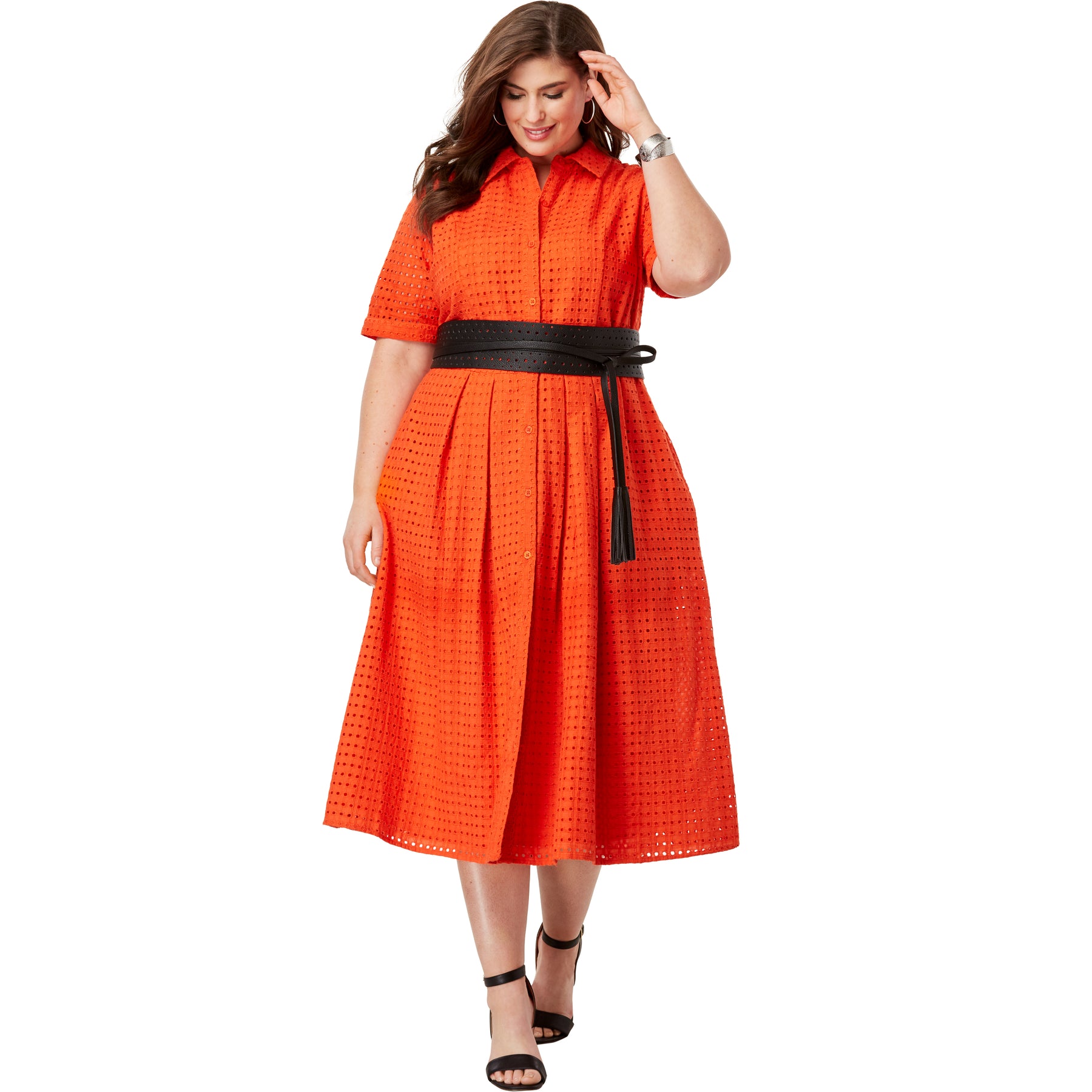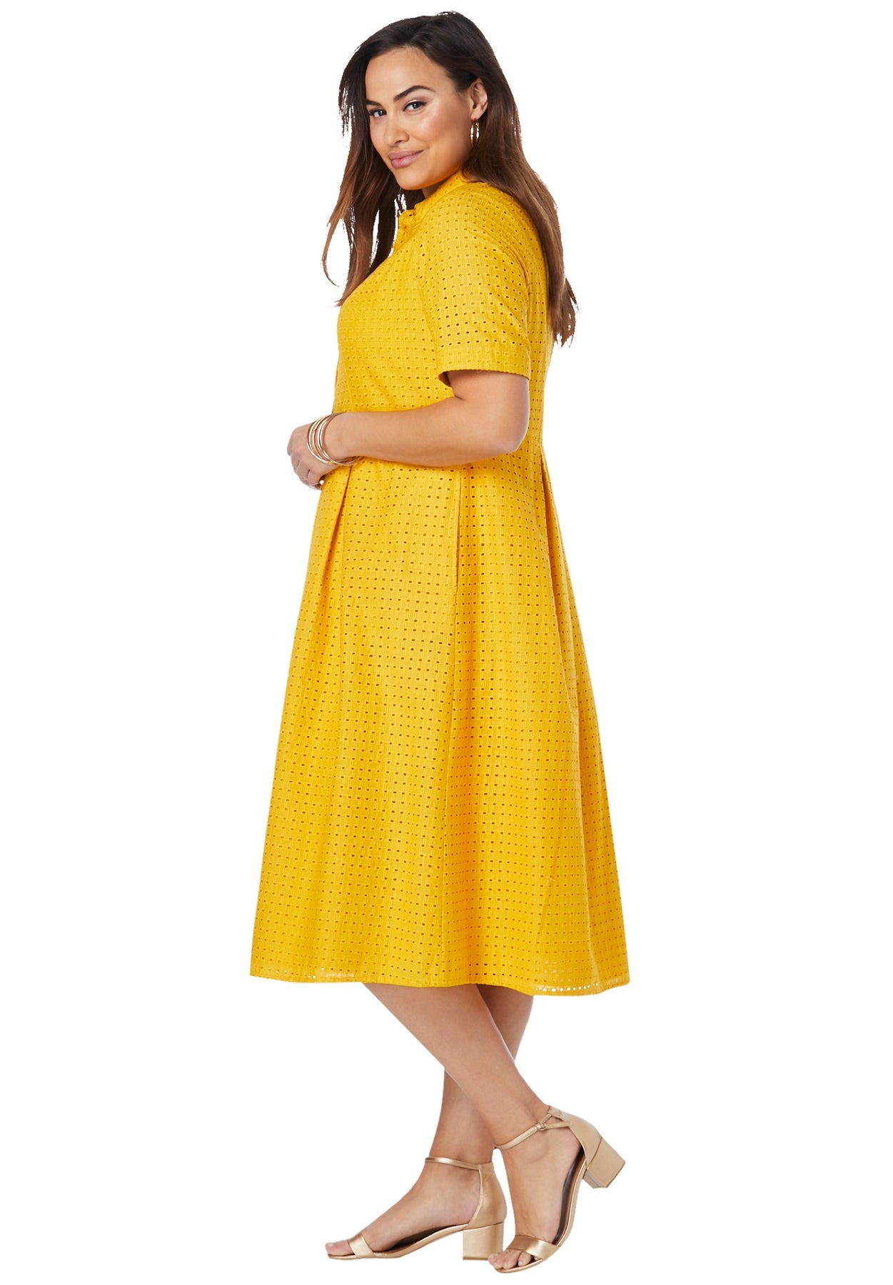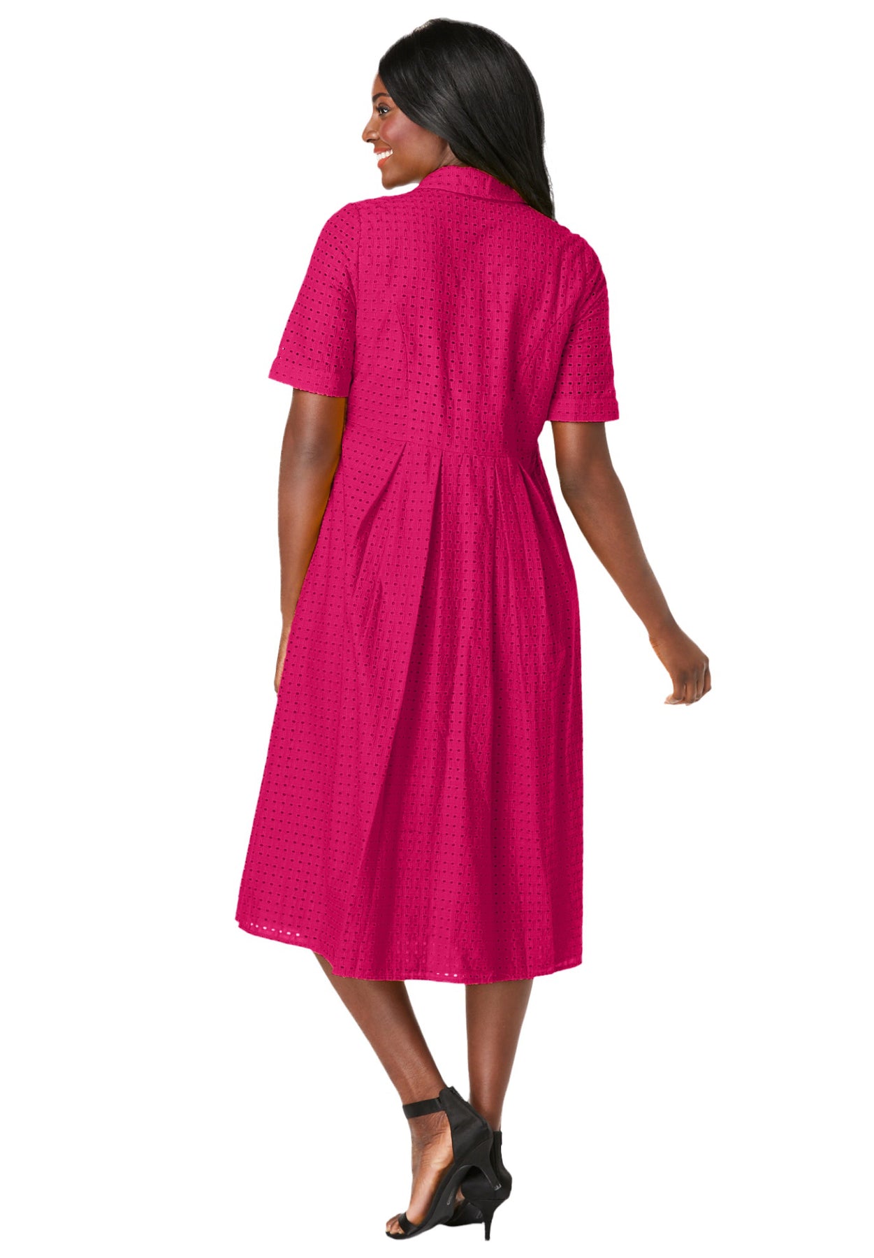 This effortlessly stylish eyelet dress features elbow-length sleeves with turnback cuffs, a full button-front placket and a shirt collar. Universally flattering fit-and-flare silhouette. Lined bodice.
