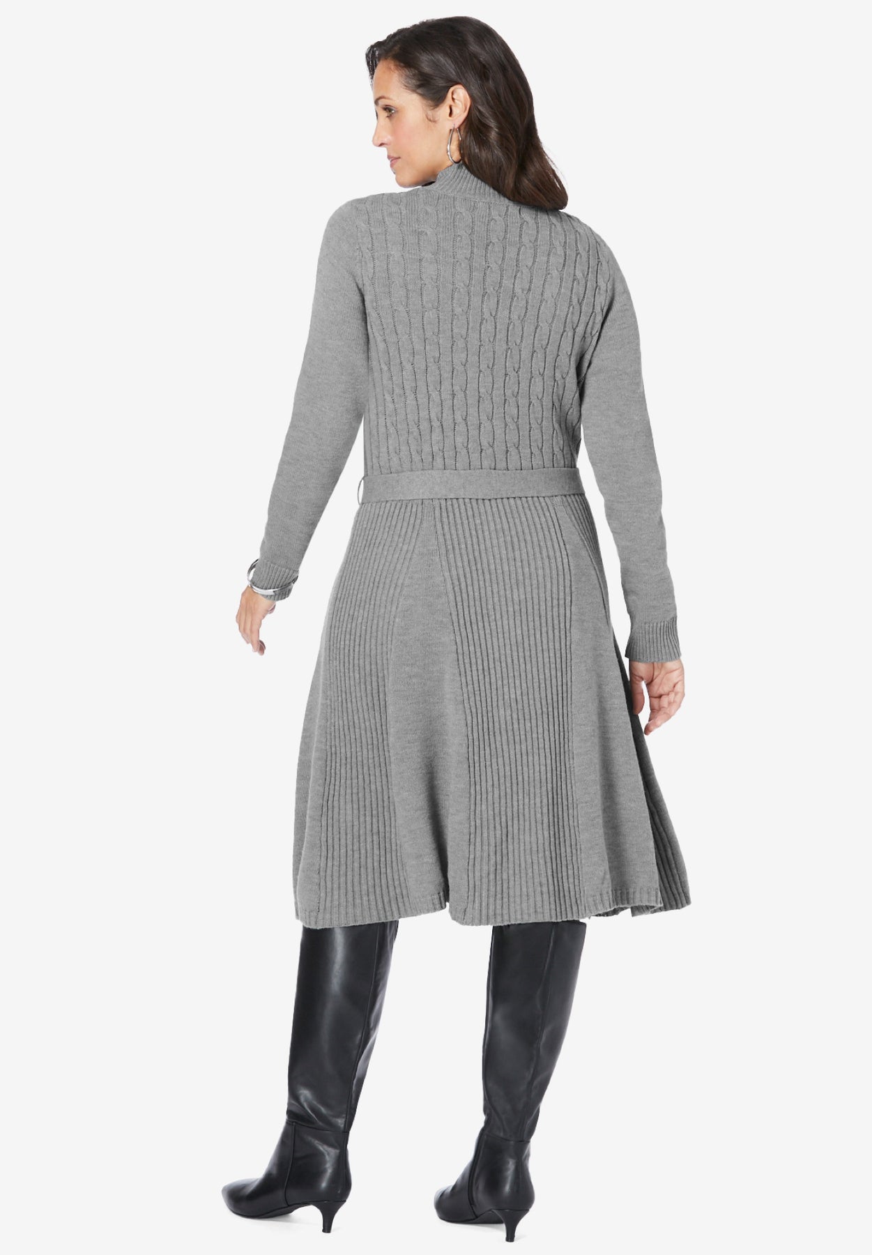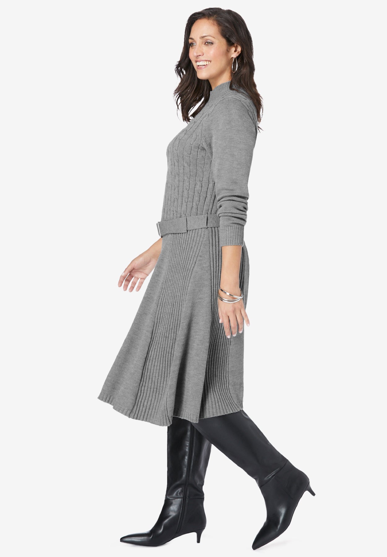 Designed in comfy cable knit, this fit-and-flare silhouette features godet pleats for extra movement. It’s stylishly detailed with a self-belt accented with a gold-tone buckle. It’s the perfect dress-up option for cooler weather.