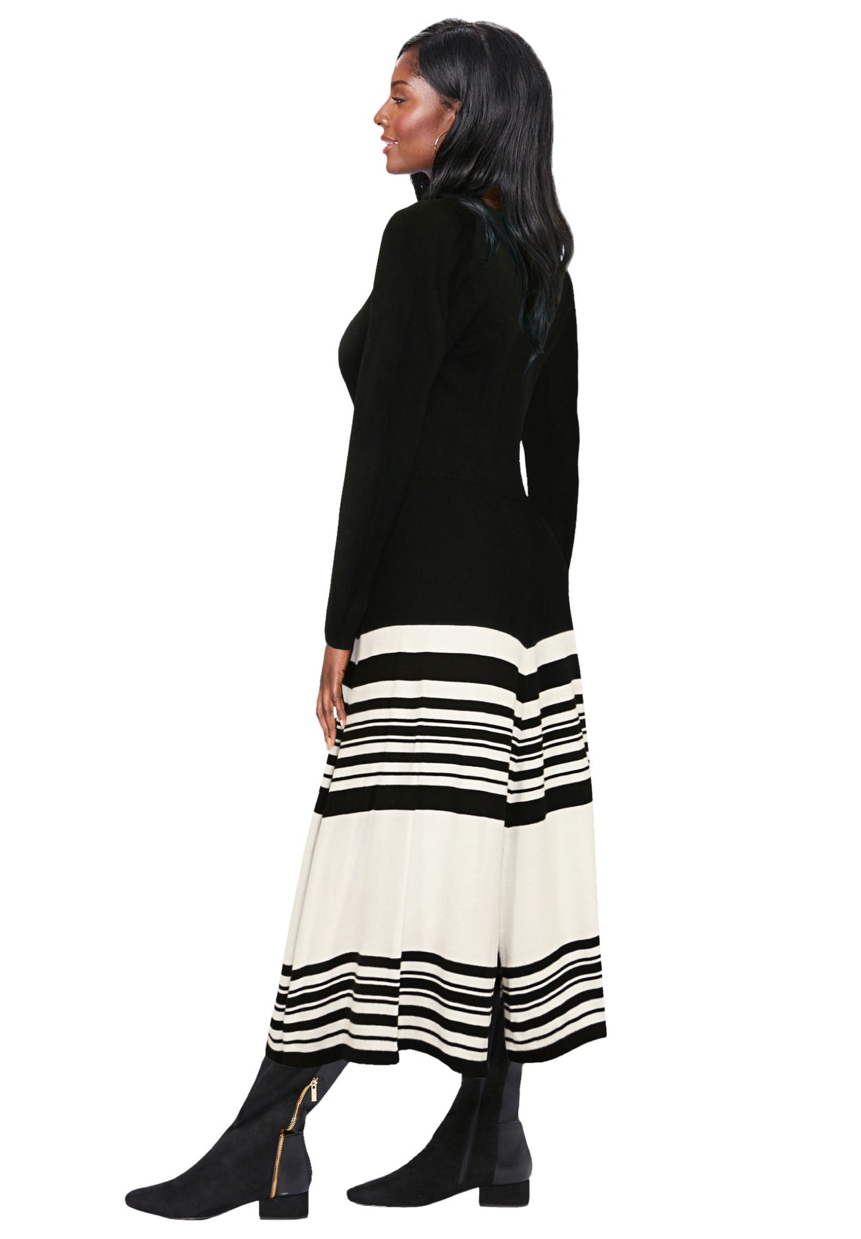 Feminine and flirty knit dress with a flared skirt makes for a sleek, chic look. Mini slits add movement. Finish your look with ankle booties.
