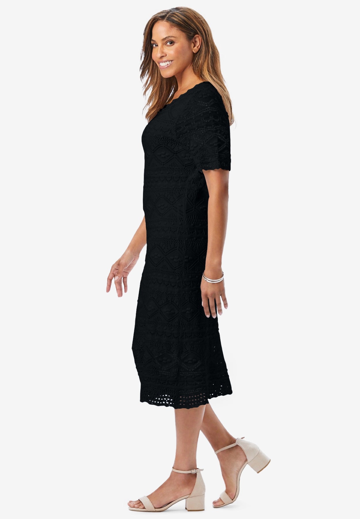 Feminine, flattering, and oh-so-fun, this dress is a perfect fit for a day that takes you from desk to dinner. Scalloped crochet edges on the neckline, cuffs, and hem elevate this classic silhouette.