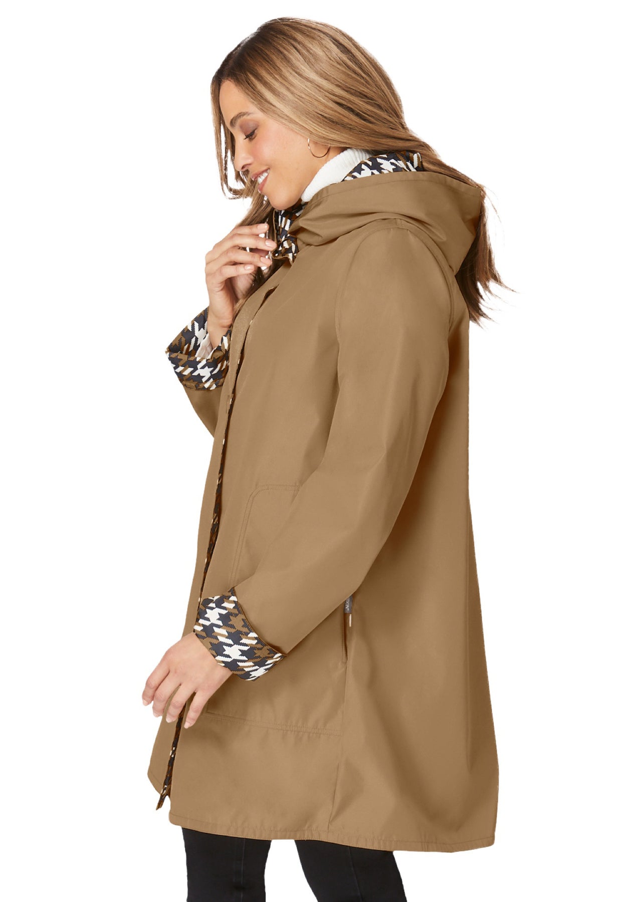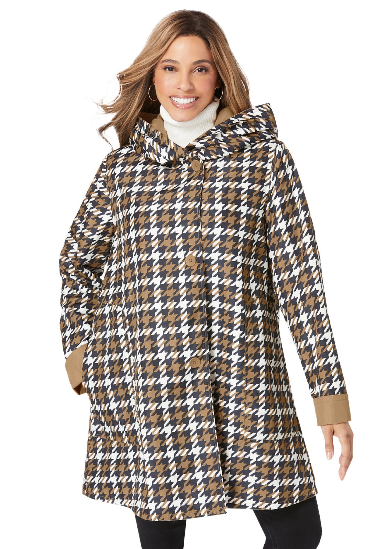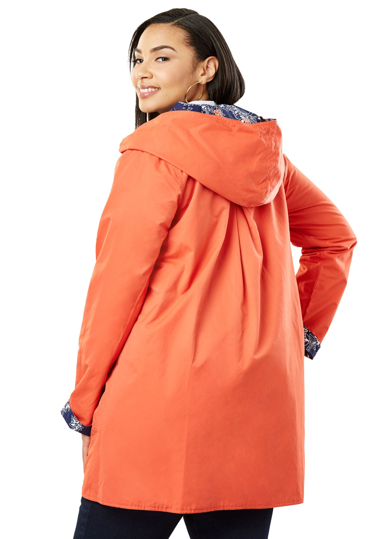 Hooded raincoat in a classically feminine shape with 3-button closure. Front angled pockets. Water resistant. Two looks in one: this raincoat is reversible with one solid and one pattered side.