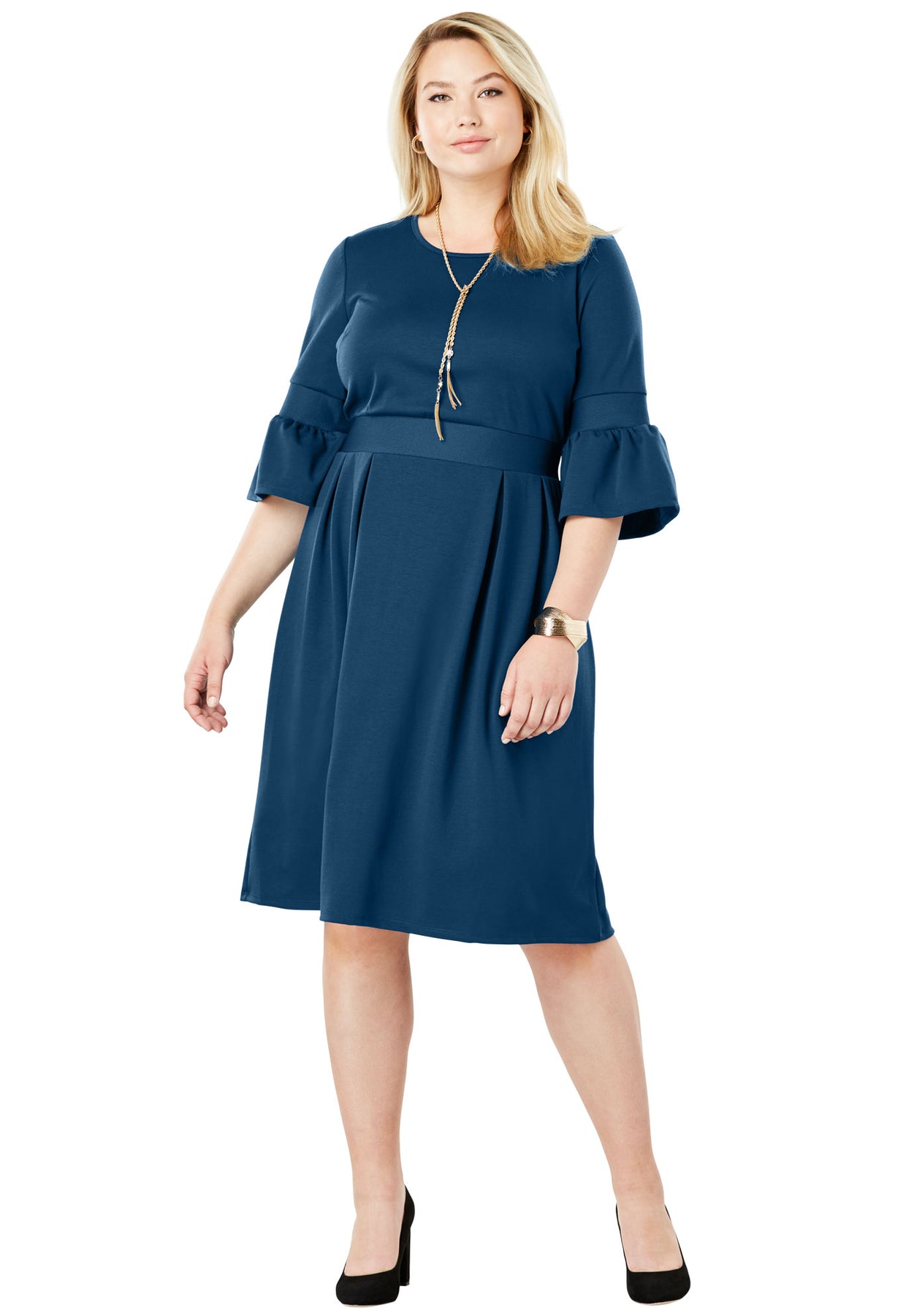 Smooth, stretch-knit ponte brings structured shape to this flirty silhouette for polished style, every day. The three-quarter sleeves offer season-spanning style and the beautiful bell detail instantly elevates your look. Whether you're headed to the office or going out for the night, this fabulous fit & flare will soon become your new go-to for effortless one-and-done dressing.