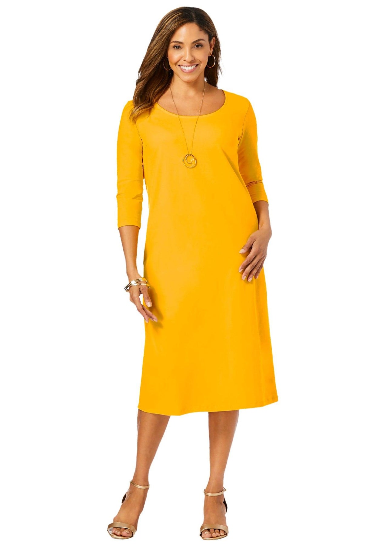 This curve-flattering feminine silhouette with 3/4 sleeves offers season-spanning style. The scoop neckline is perfectly proportioned to smartly conceal bra straps. Pair with sandals for warm weather and swap out for booties when temps dip.
