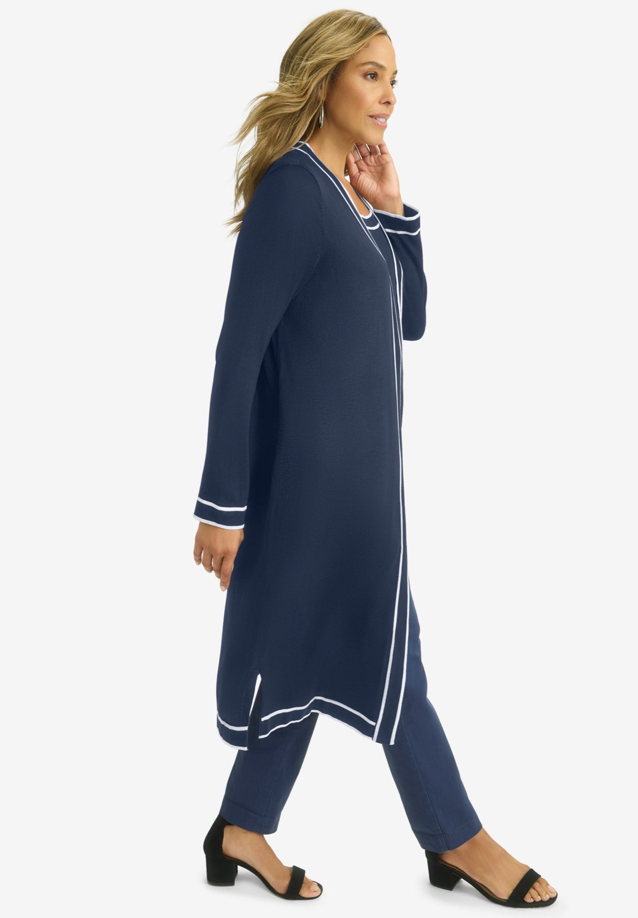 Relaxed and sophisticated, this sleek duster cardigan adds a touch of elegance to your everyday style. The contrast tipping enhances this timeless piece, making it perfect for both work and casual outings. For a complete look, pair it with the matching tank, modern chinos, and pointed-toe flats.