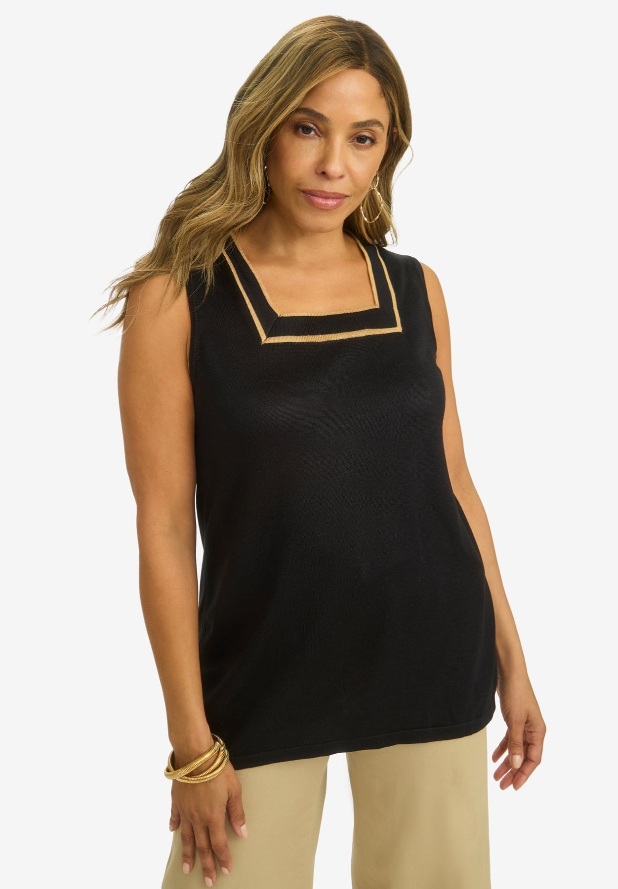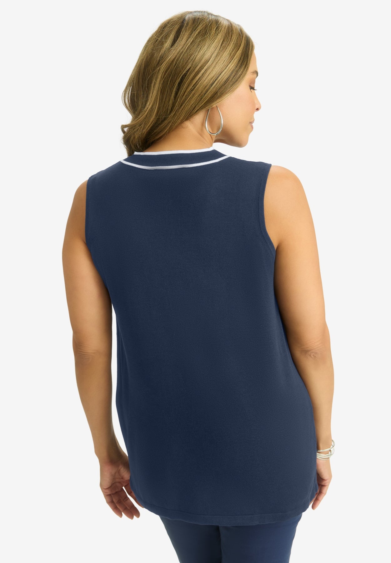 This versatile tank is perfect for layering under your favorite toppers year-round. The contrast tipping adds a touch of sophistication. Pair it with the matching Tipped Duster Cardigan for a coordinated look and finish your outfit with jeans or chinos.