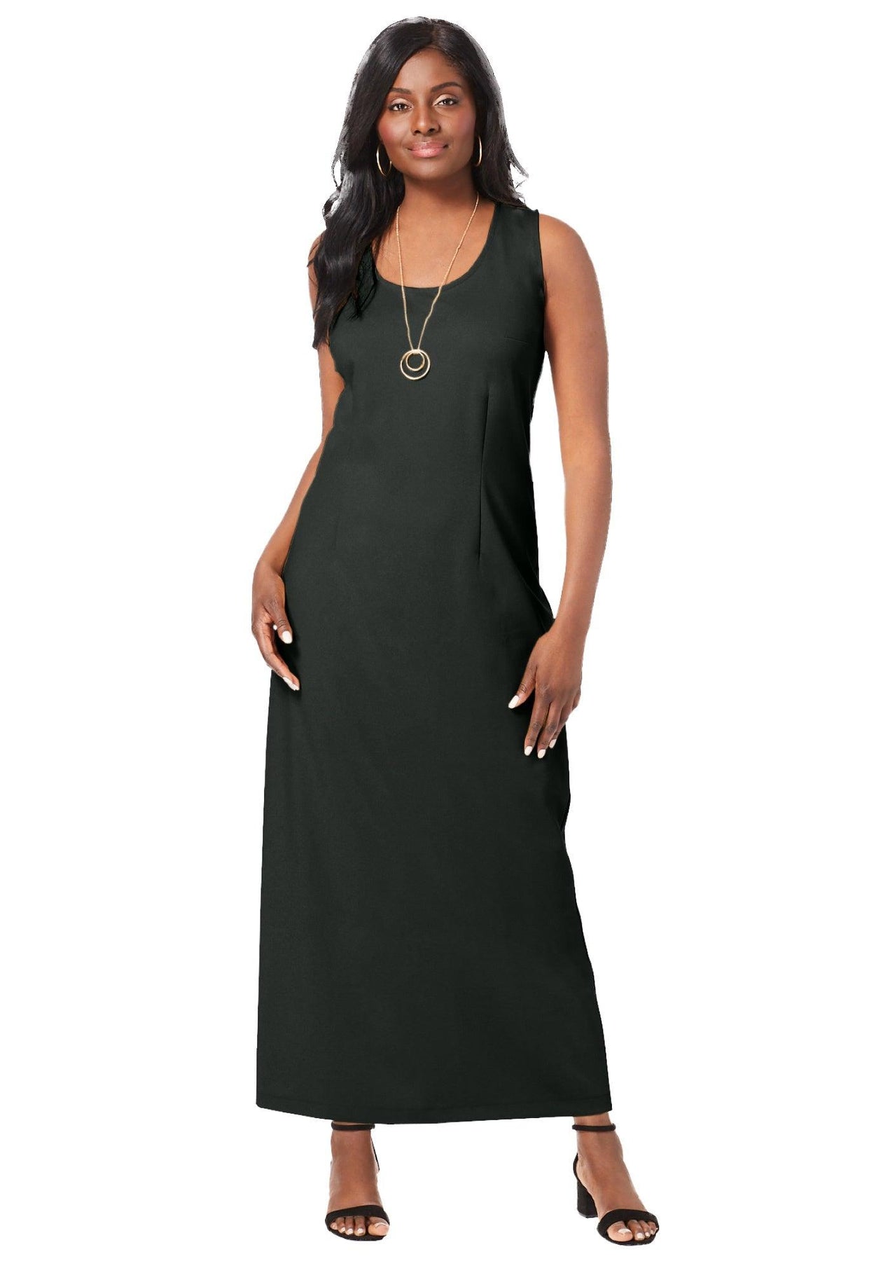 Cocoon jacket with contrast border eases over an elegant tank dress with back zip closure.