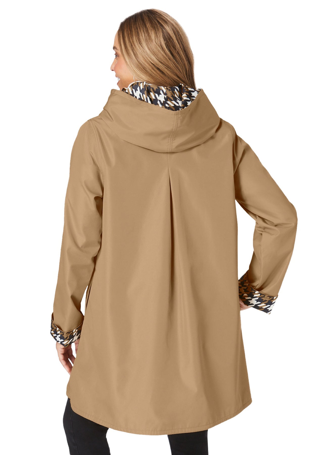 Hooded raincoat in a classically feminine shape with 3-button closure. Front angled pockets. Water resistant. Two looks in one: this raincoat is reversible with one solid and one pattered side.