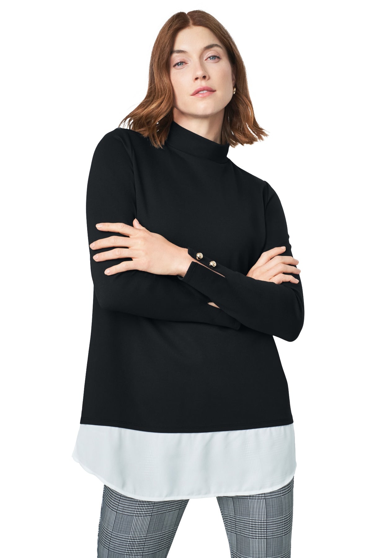 Achieving a layered, sophisticated look is easy with the Jessica London women's plus size Mixed Media Ponte Top. This piece pairs perfectly with our Ponte Leggings — complete your outfit with your favorite pumps or knee-high boots.