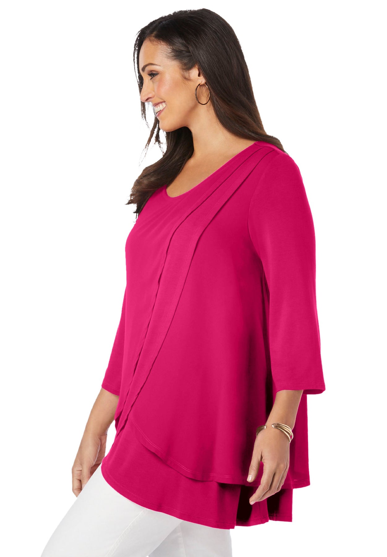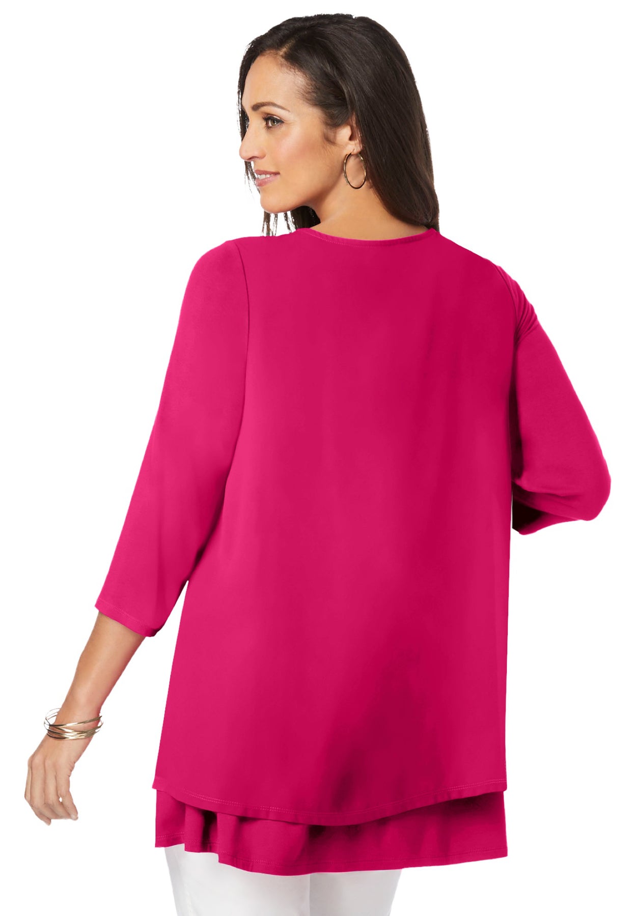 A crossover panel with contrast Georgette layer adds textural appeal and a breezy element to the Jessica London women's plus size high-low Double Layer Tunic. Pair it with skinny jeans for a play on proportion.