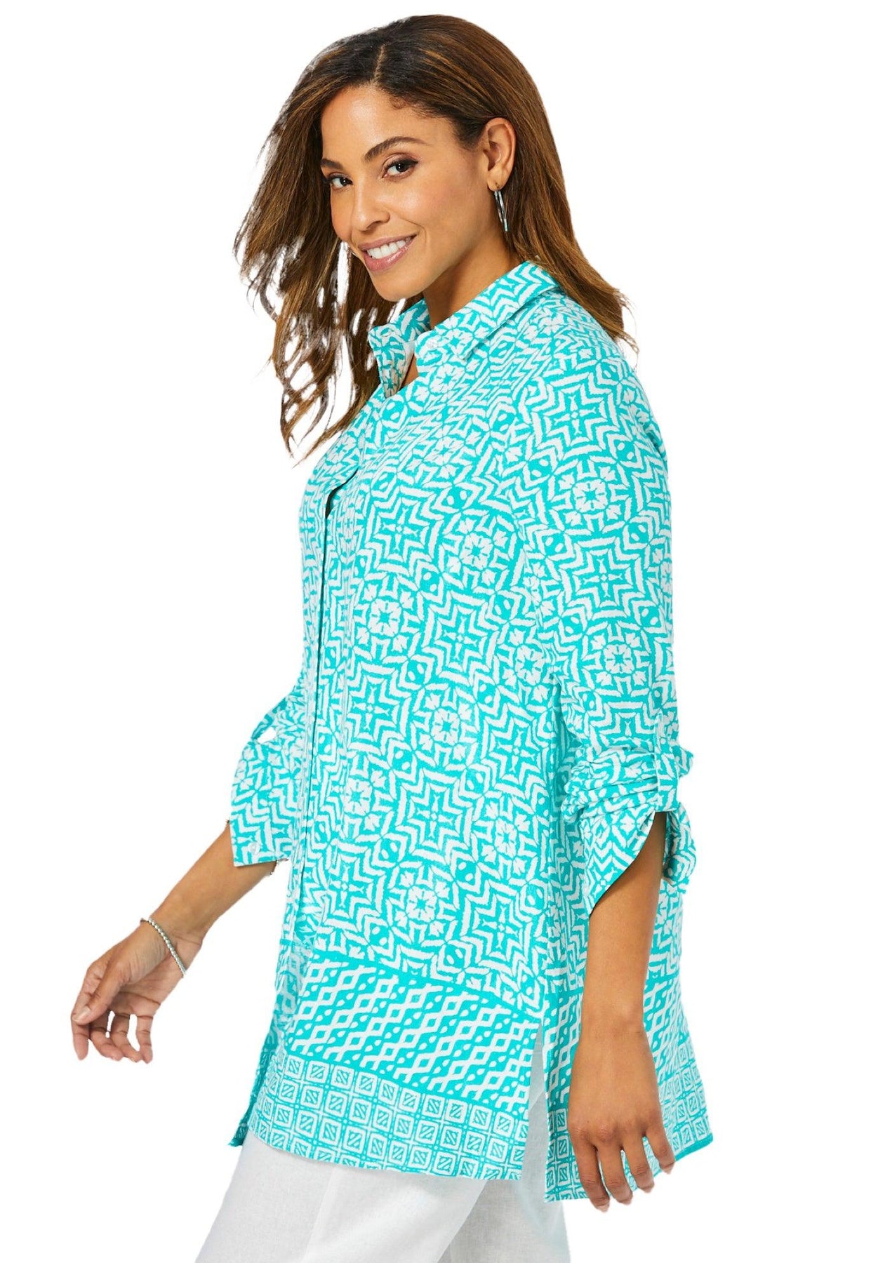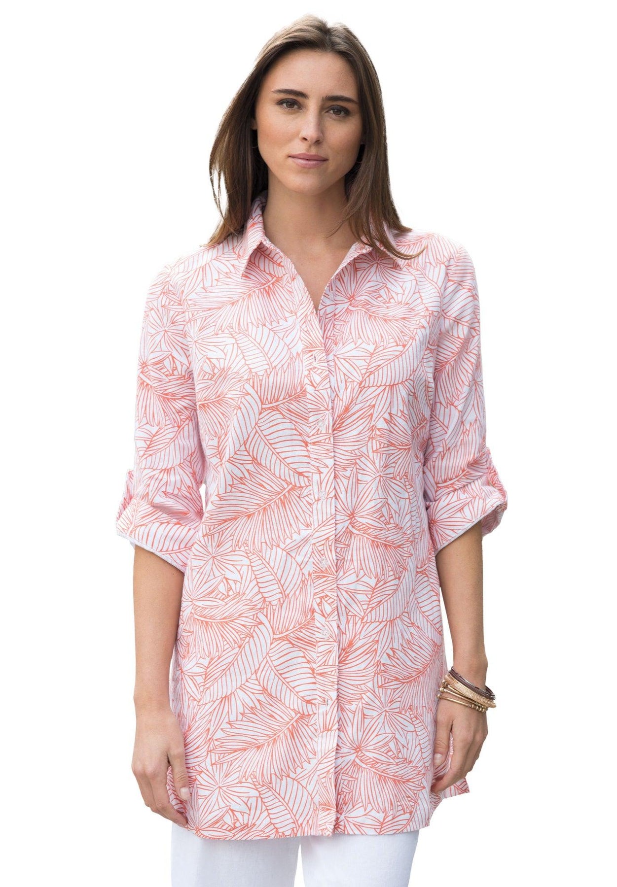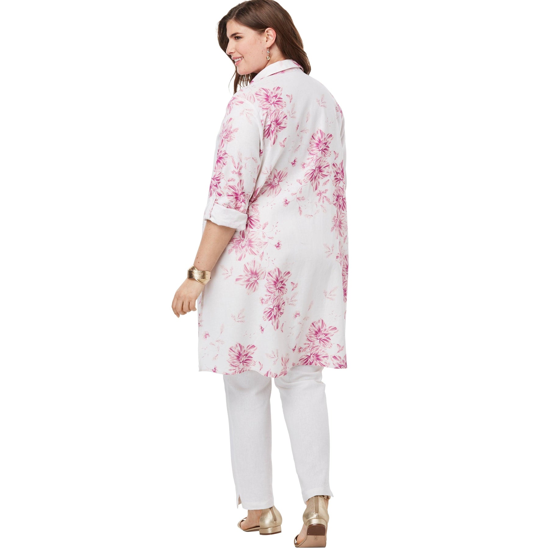 You'll love the effortless look and easy coverage of this button-front duster. Roll-tab long sleeves, straight hem.