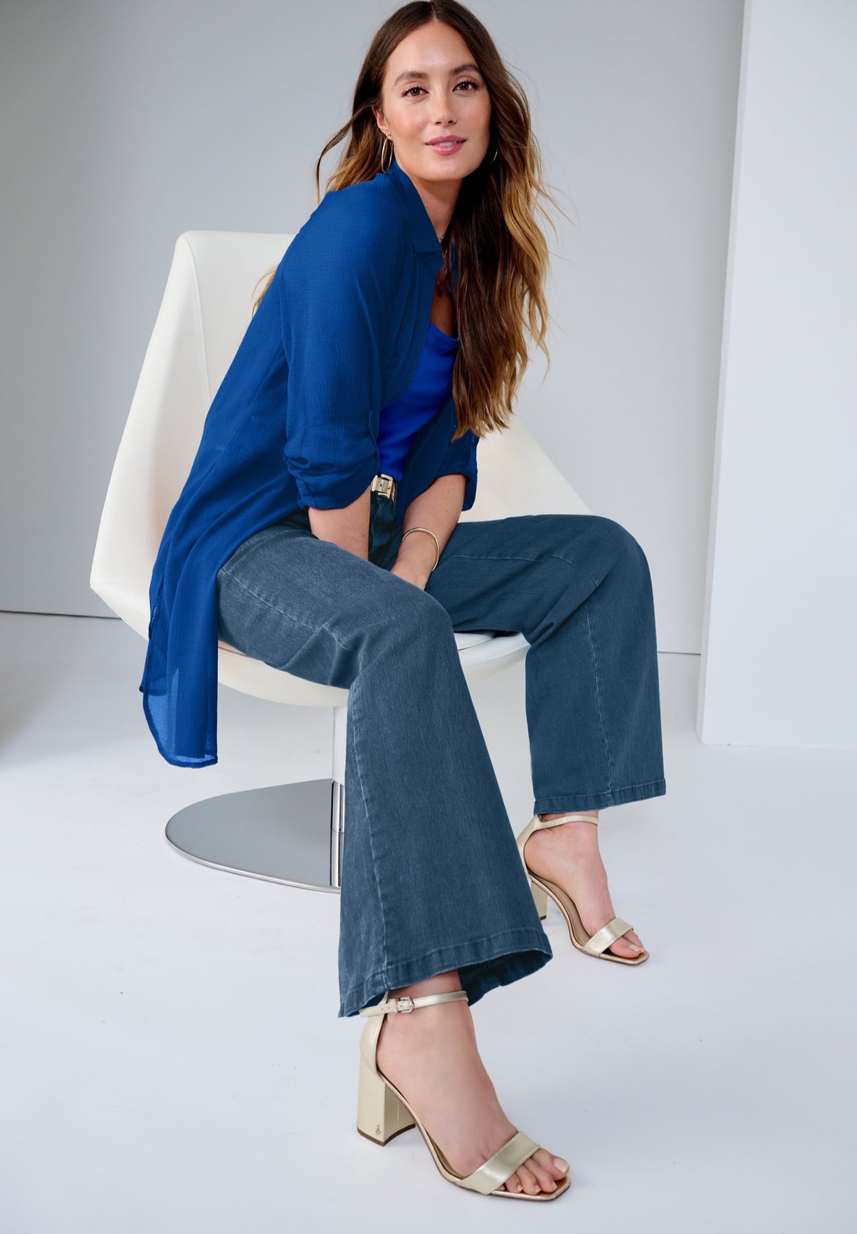 Round out your denim collection with the Jessica London plus size women's True Fit Wide Leg Jean. Wear it with our Wrinkle-Free Poplin Shirt for a casual look that feels perfectly polished.