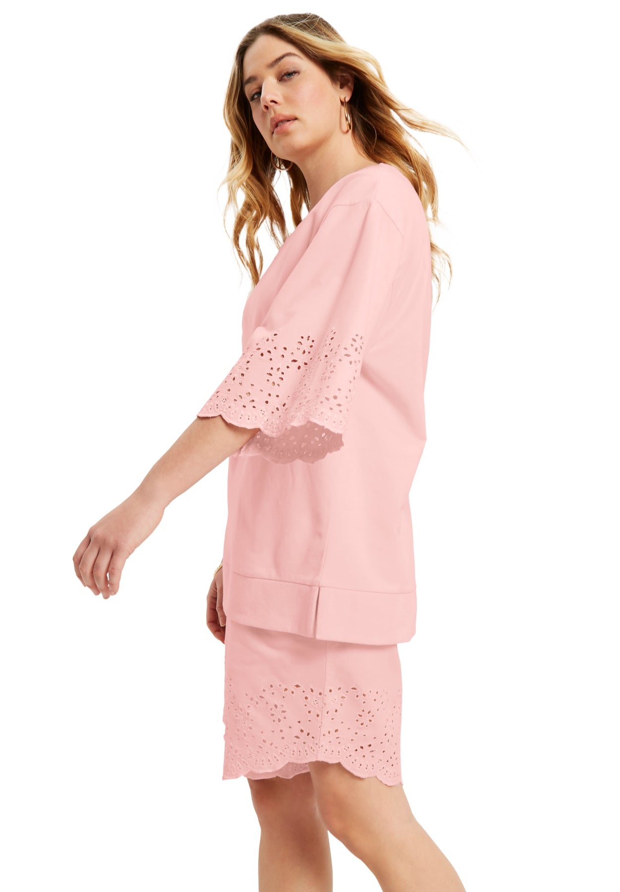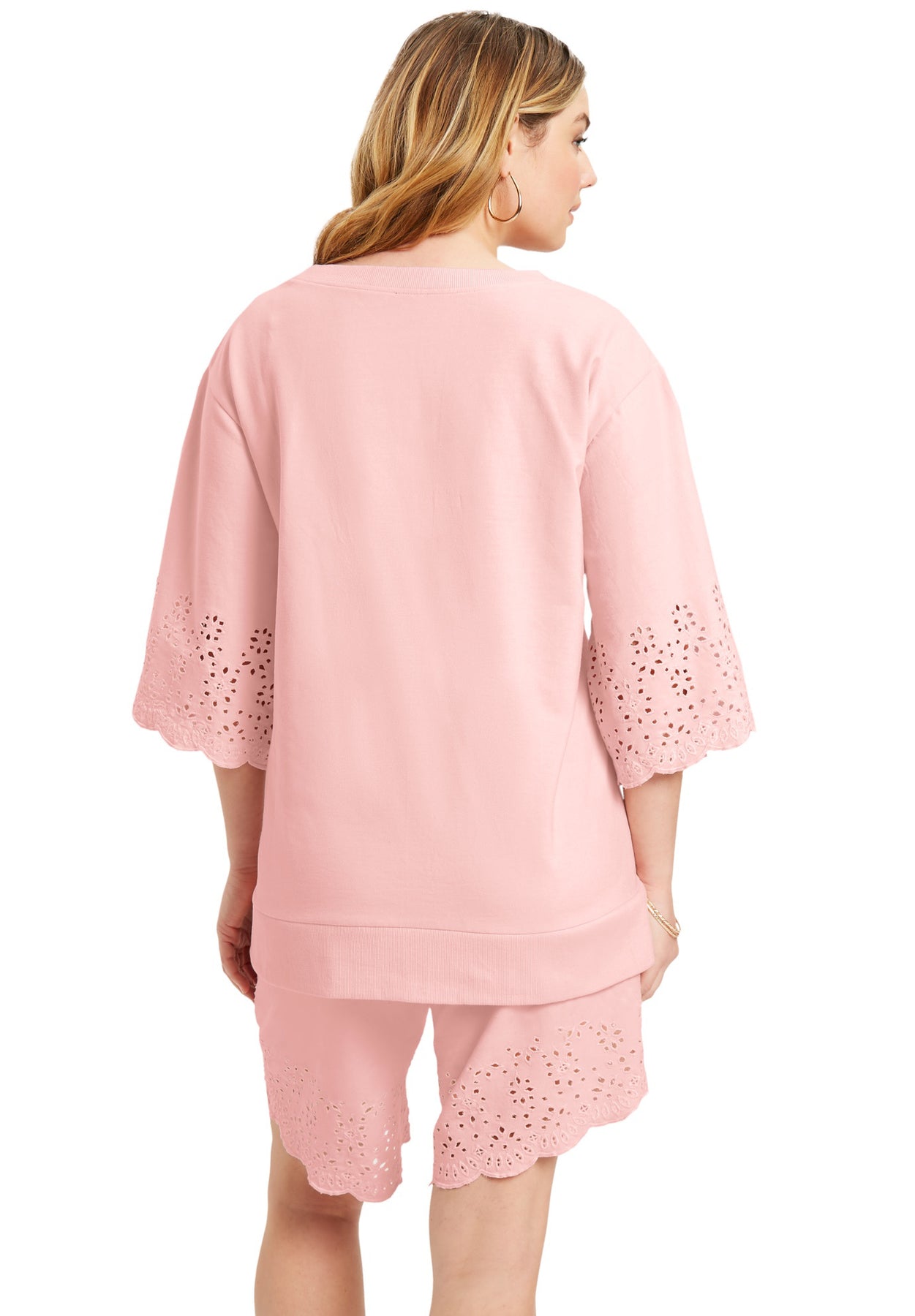 Matching is made easy with this coordinating summer set. A crewneck drop-shoulder top features elbow-length sleeves decorated with eyelet detailing and scallop hem. The top pairs effortlessly with matching elasticized-waist shorts featuring a functional drawstring and side seam pockets. Wear together or as two separate pieces!