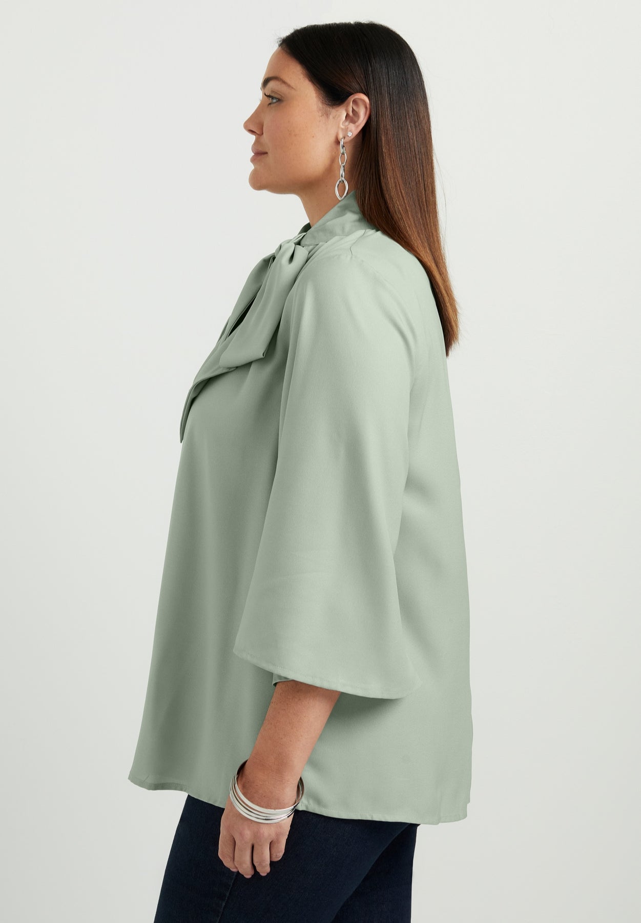 Put a good twist on your next outfit with this mock tie neck blouse. It's cinched with a bowtie at its collar for a graceful yet effortless standout to pair with wide-leg pants or jeans and heels. Three-quarter flutter sleeves add a flowy final touch.