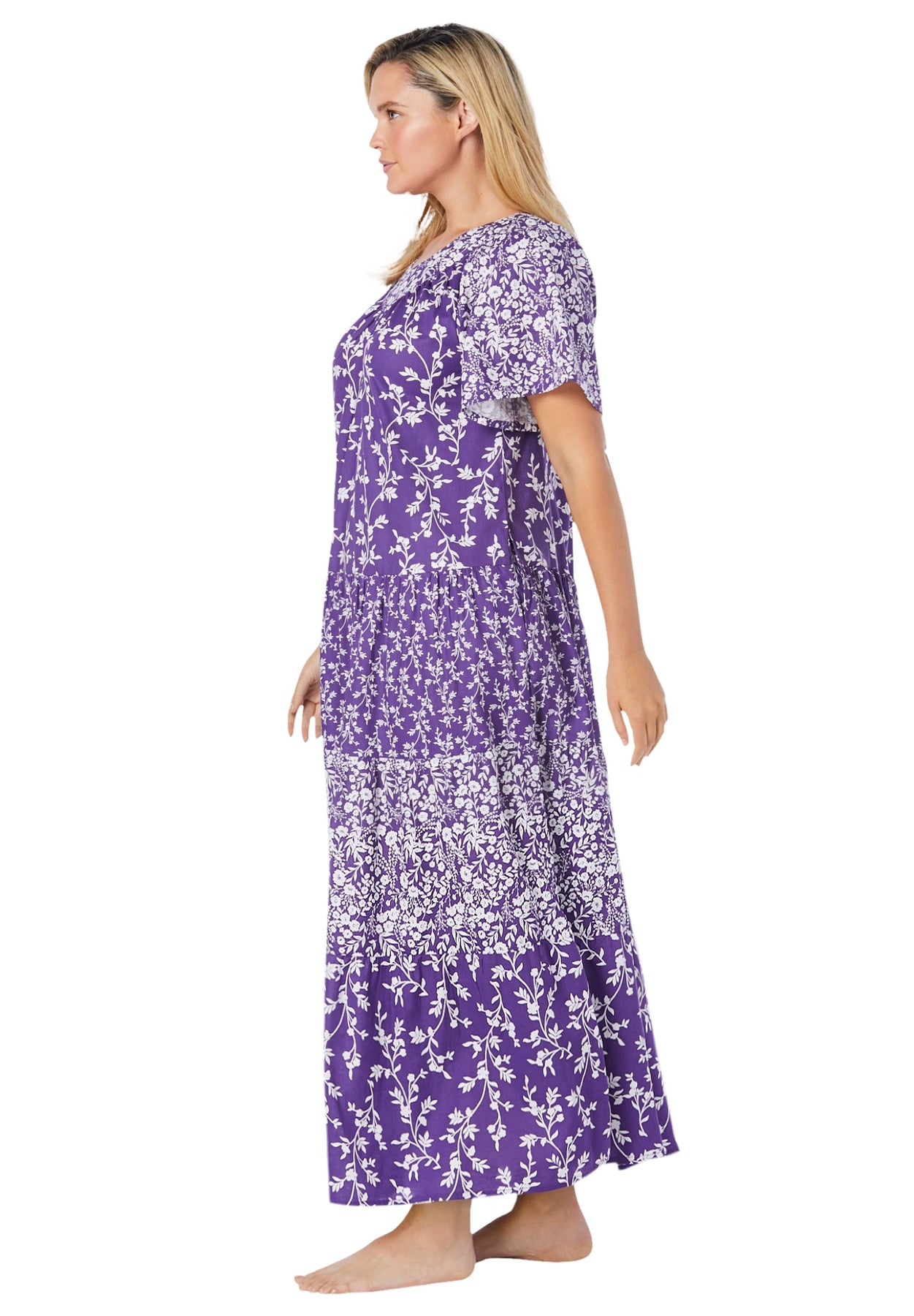 Gathered tiers create a full skirt in this pretty lounger, made from lightweight cotton that's perfect for relaxing or sleeping. Flutter sleeves and a V-neck add to the pretty details that are oh-so feminine.