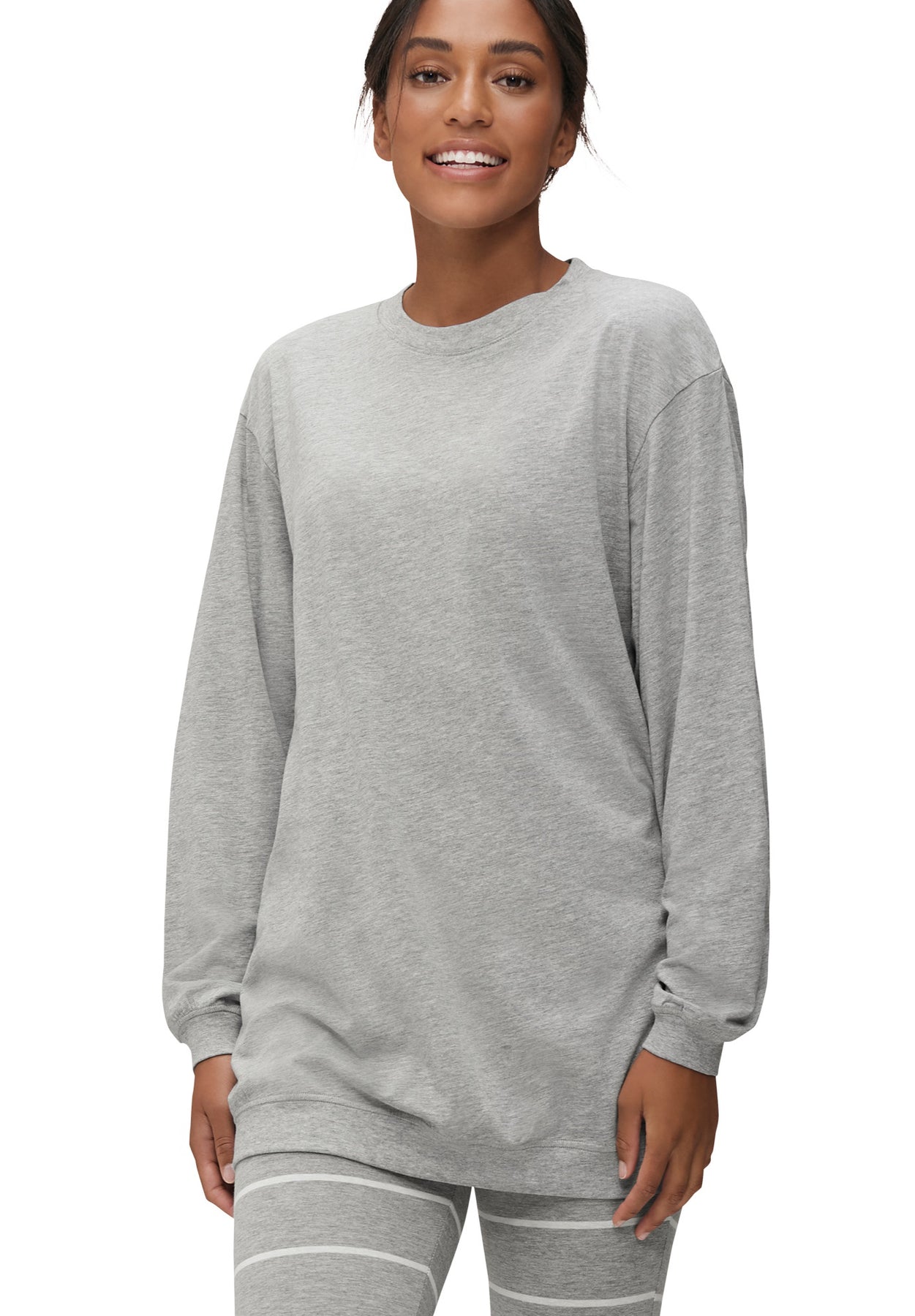 Comfort meets style with these cute, patterned leggings paired with a solid, oversized tunic, finished with a ribbed banded hem. Both pieces are crafted from lightweight cotton/spandex jersey with just the right amount of stretch, perfect for lounging or sleeping in style.