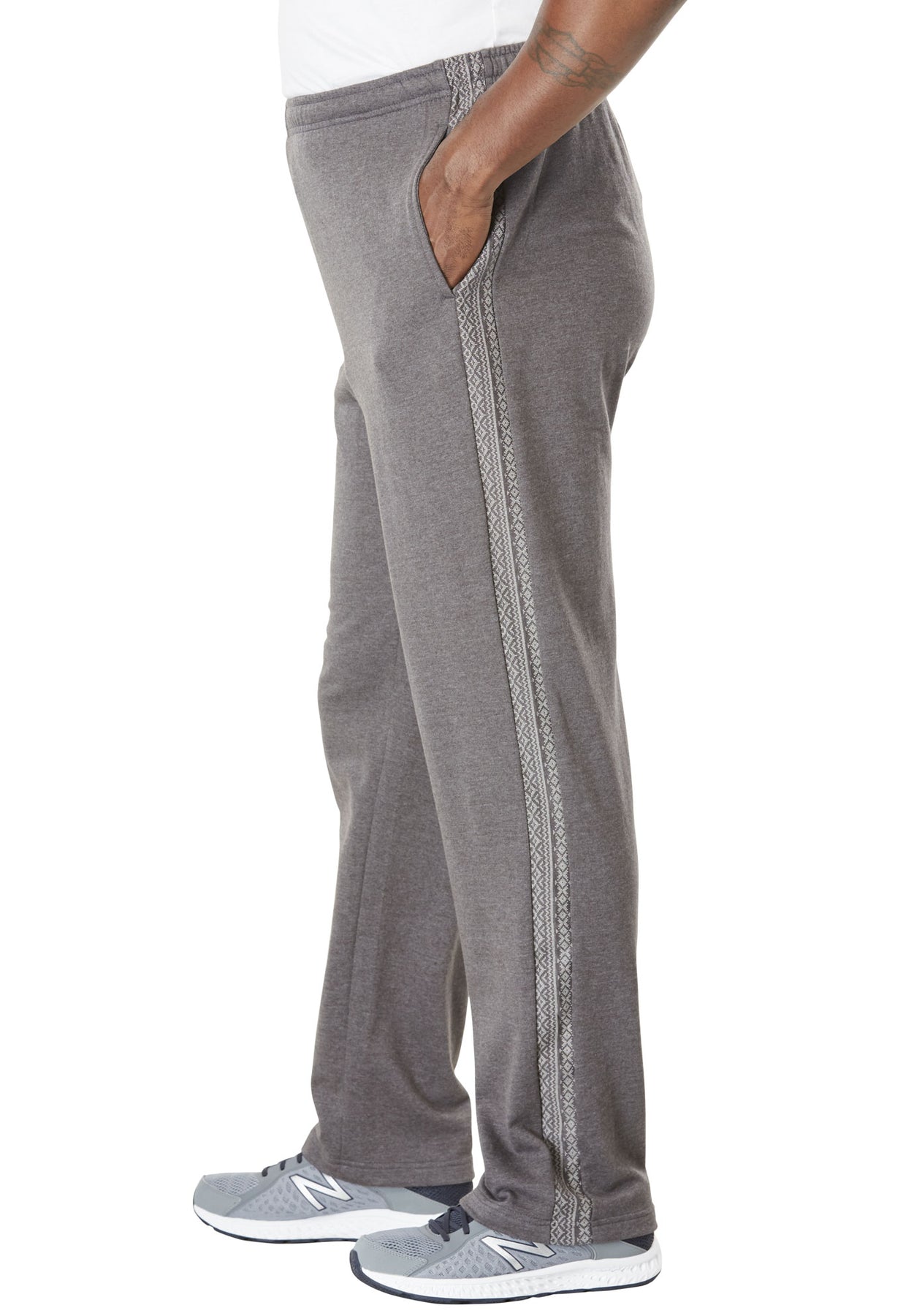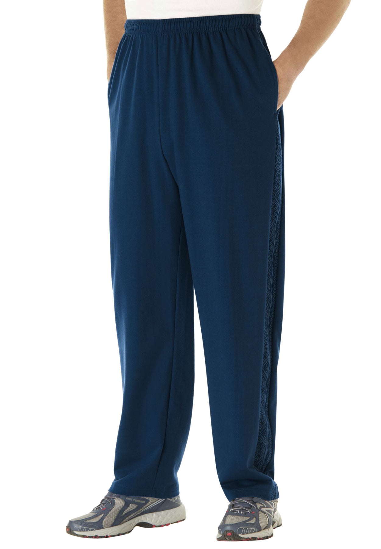 Elastic waist cozy-warm sweatpants with inner drawstring, one button-through back and two side seam pockets, open hems. Printed side panels on outside of legs.