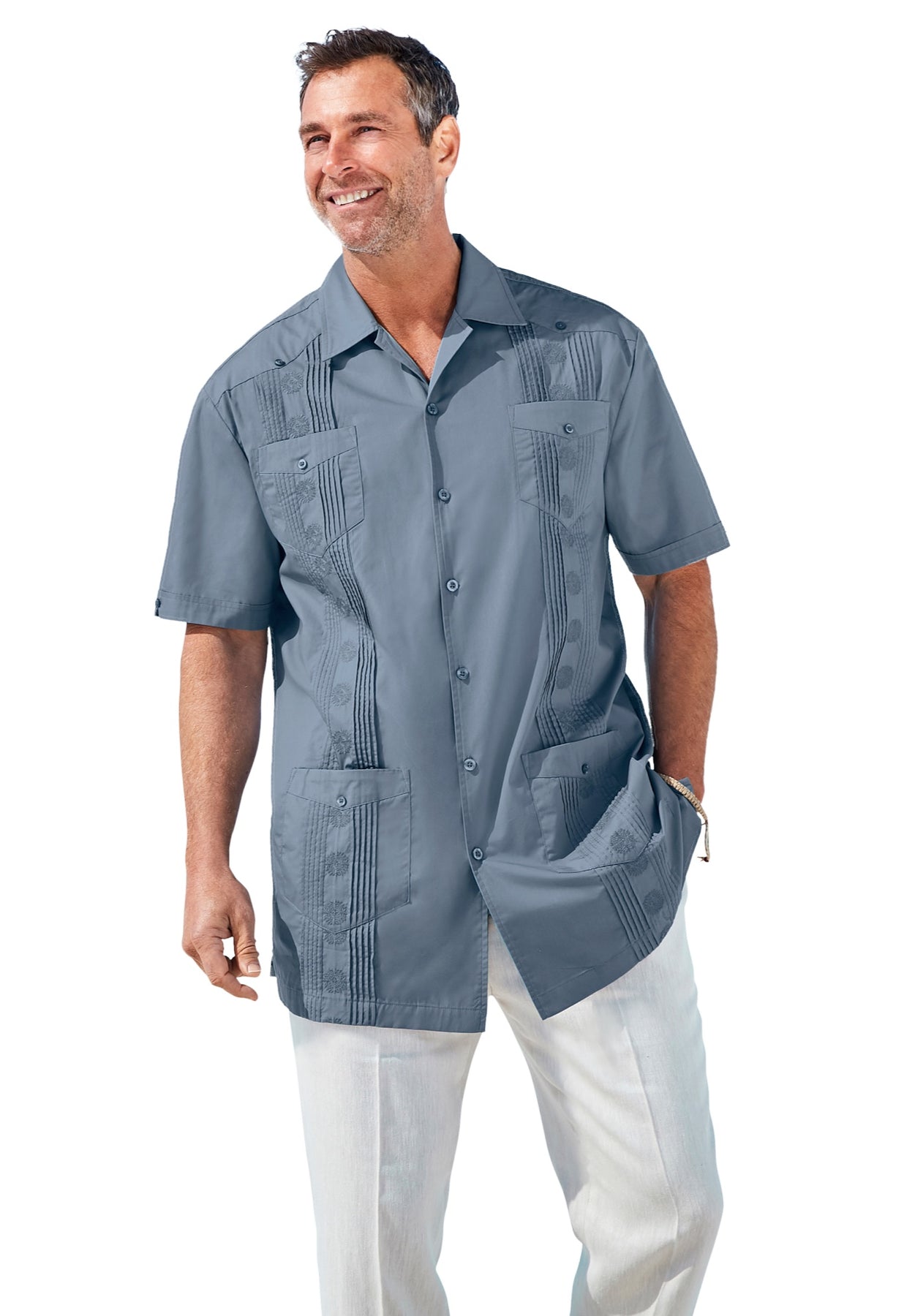 Our Short-Sleeve Guayabera Shirt is a warm weather style at its best. It has a looser fit and is made from a breezy woven cotton blend. Embroidered stitching makes it an eye-catching wardrobe standout.