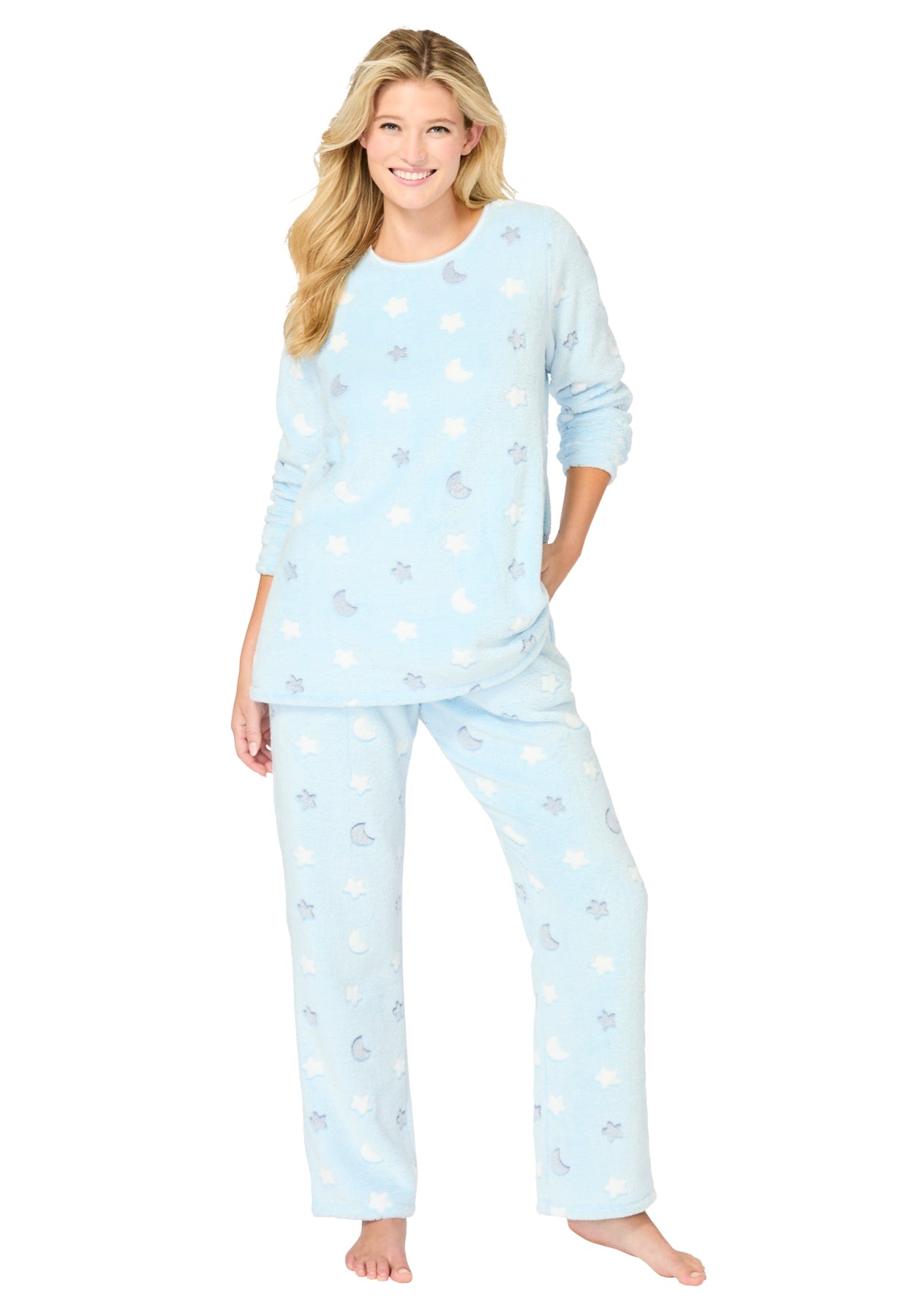 Slip into pure softness with the Avenue Body 2-Piece Fluffy PJ Set, designed for the ultimate lounge-and-relax experience. The top features a relaxed fit with a classic crew neckline, set-in sleeves, and a straight hem that hits at 30” for easy, flattering coverage. The matching pants are made for all-day comfort with a slightly wide leg, elastic waistband for a perfect fit.