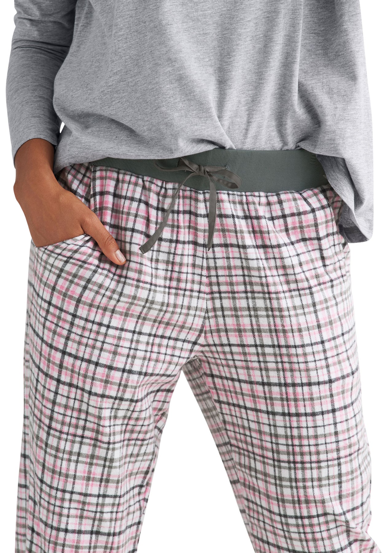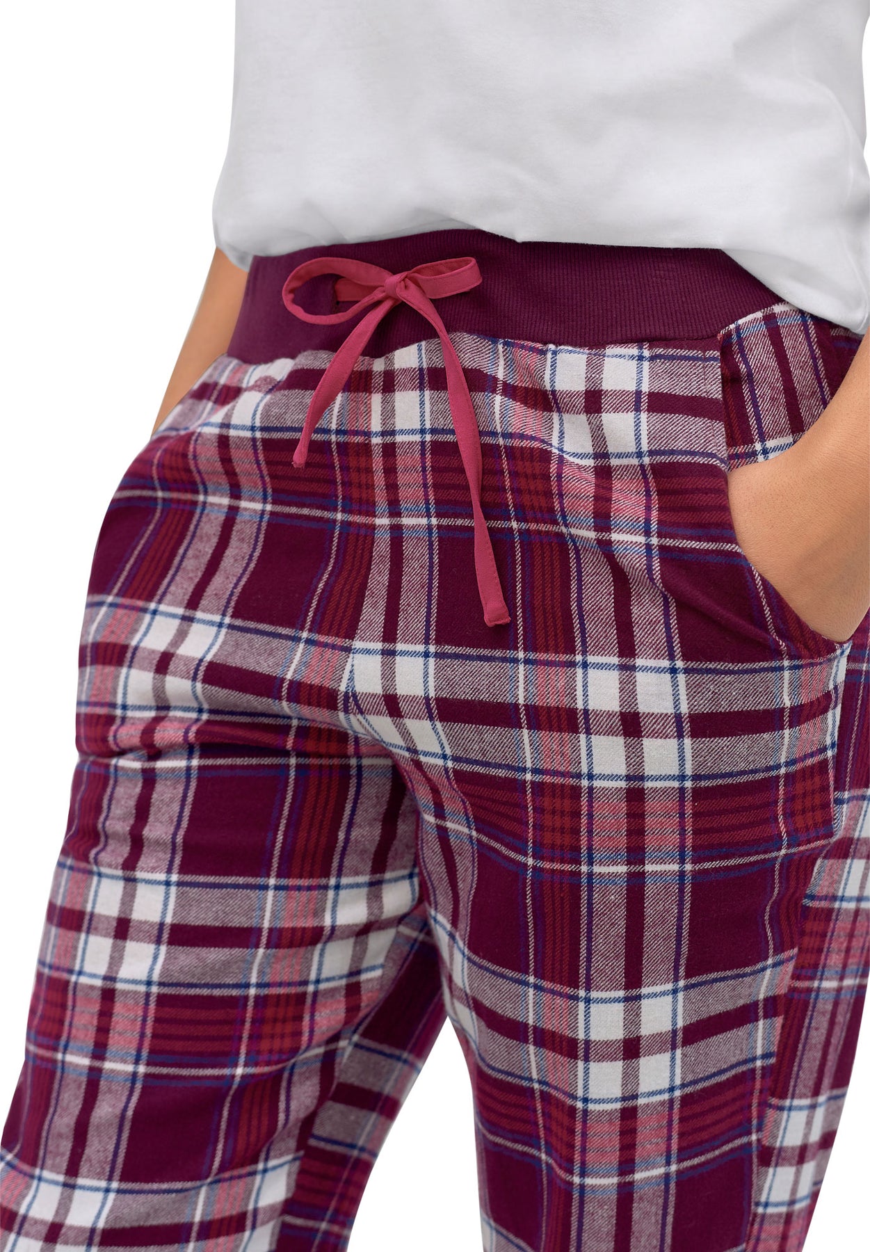 Soft yarn-dyed plaid flannel pants in a relaxed fit. Ribbed elastic waistband with twill tape drawstring. Side pockets.