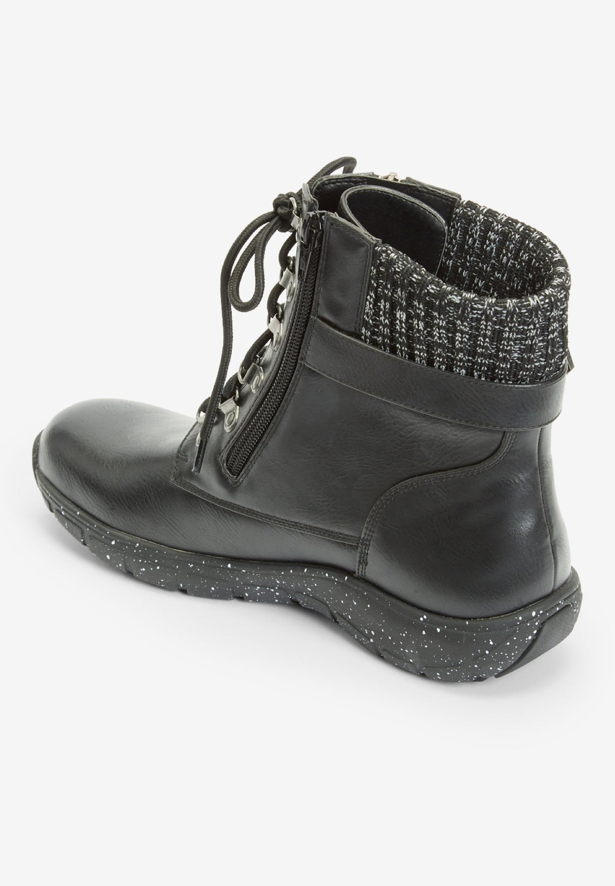 For comfort and style in every step, this boot delivers! Features stylish details like knit trim on the leather-like upper and comfort innovations like the adjustable front lace and padded insole.