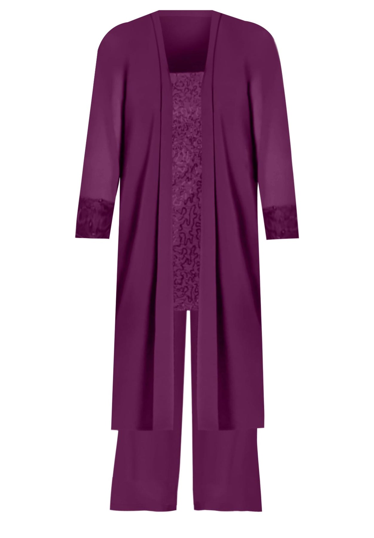 This timeless set makes an elegant, going-out statement. The duster jacket features an open front, sheer three-quarter sleeves and sequin cuffs. Allover lace top with a feminine square neck and squareneck sleeveless top with jersey knit back. Elasticized wide-leg pant.