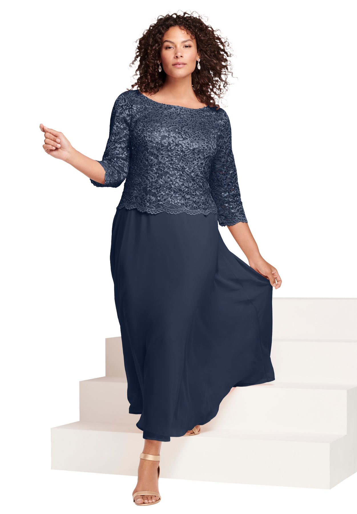 Plus Size Sparkle Lace Popover A-Line Gown with 3/4 Sleeves