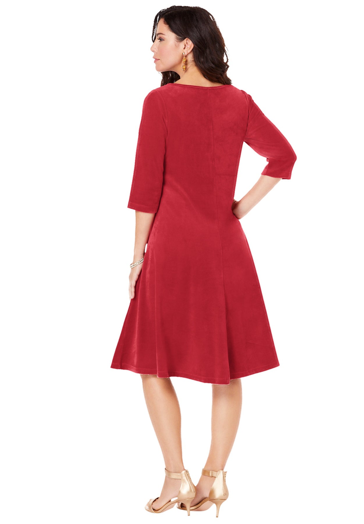 Bring the glam in this stunning swing dress crafted in luxe velour. With a boat neckline, three-quarter sleeves and a swing silhouette, it's perfect for layering under a light jacket.