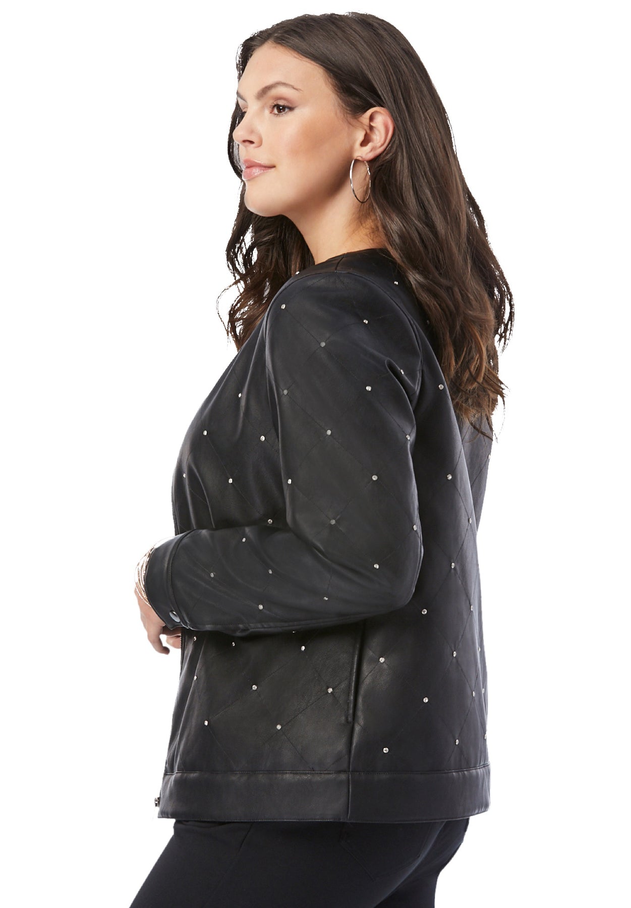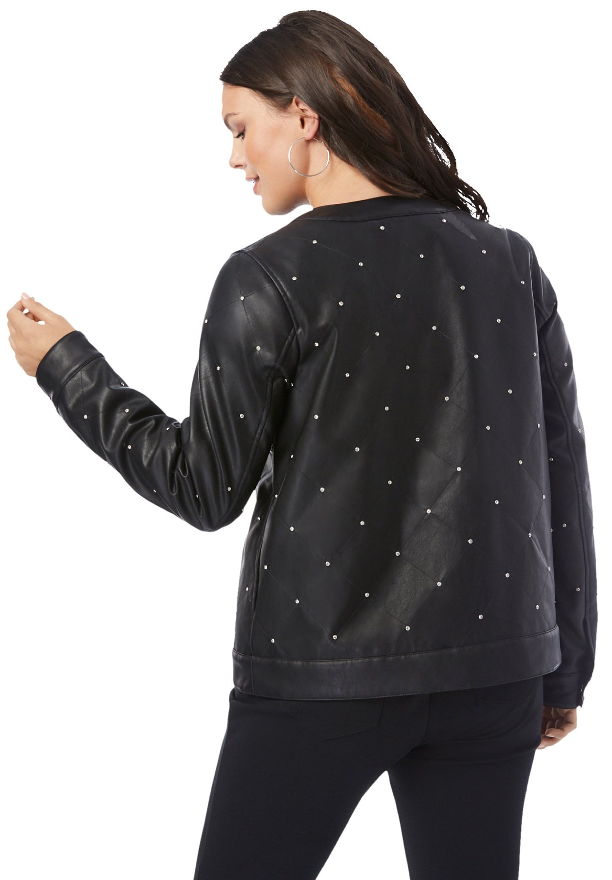 This ever-cool bomber gets an edgy update in this quilted style with rhinestone stud details. It's a great topper to jeans and tops. With a banded collar, sleeves, and hem for definition and a zip front and side pockets it's sure to turn heads.