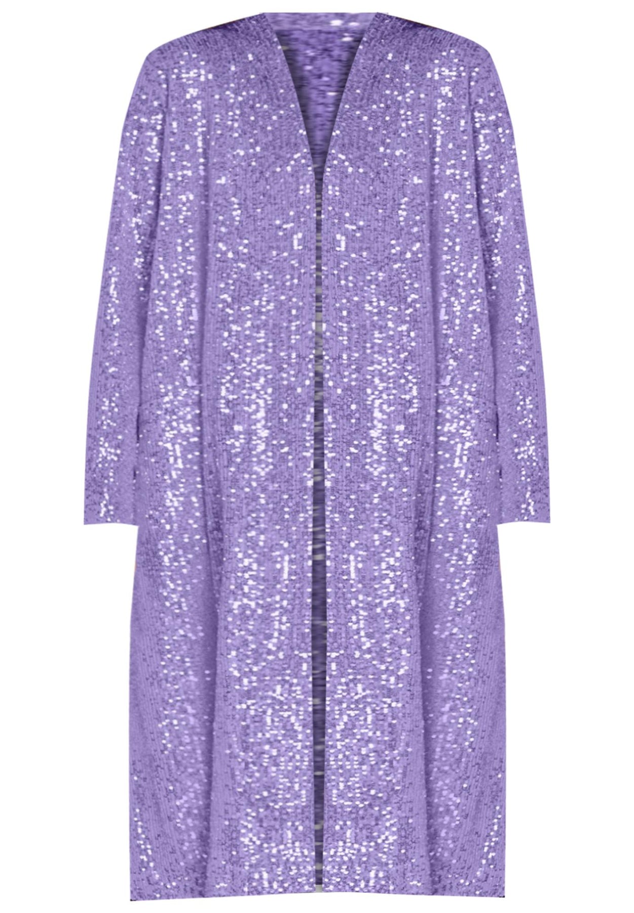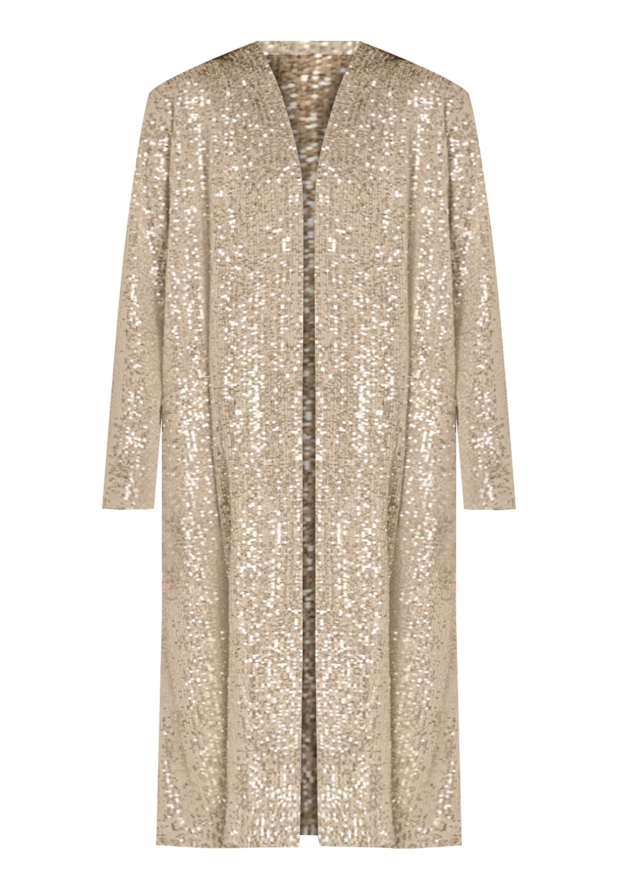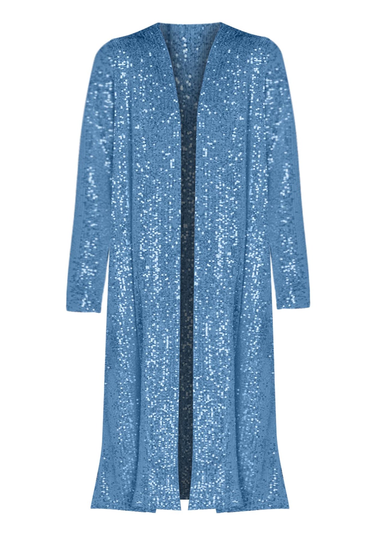 This effortless, shimmering duster goes to great lengths for standout style. It's fully lined with front pockets and a flowing open-front silhouette.