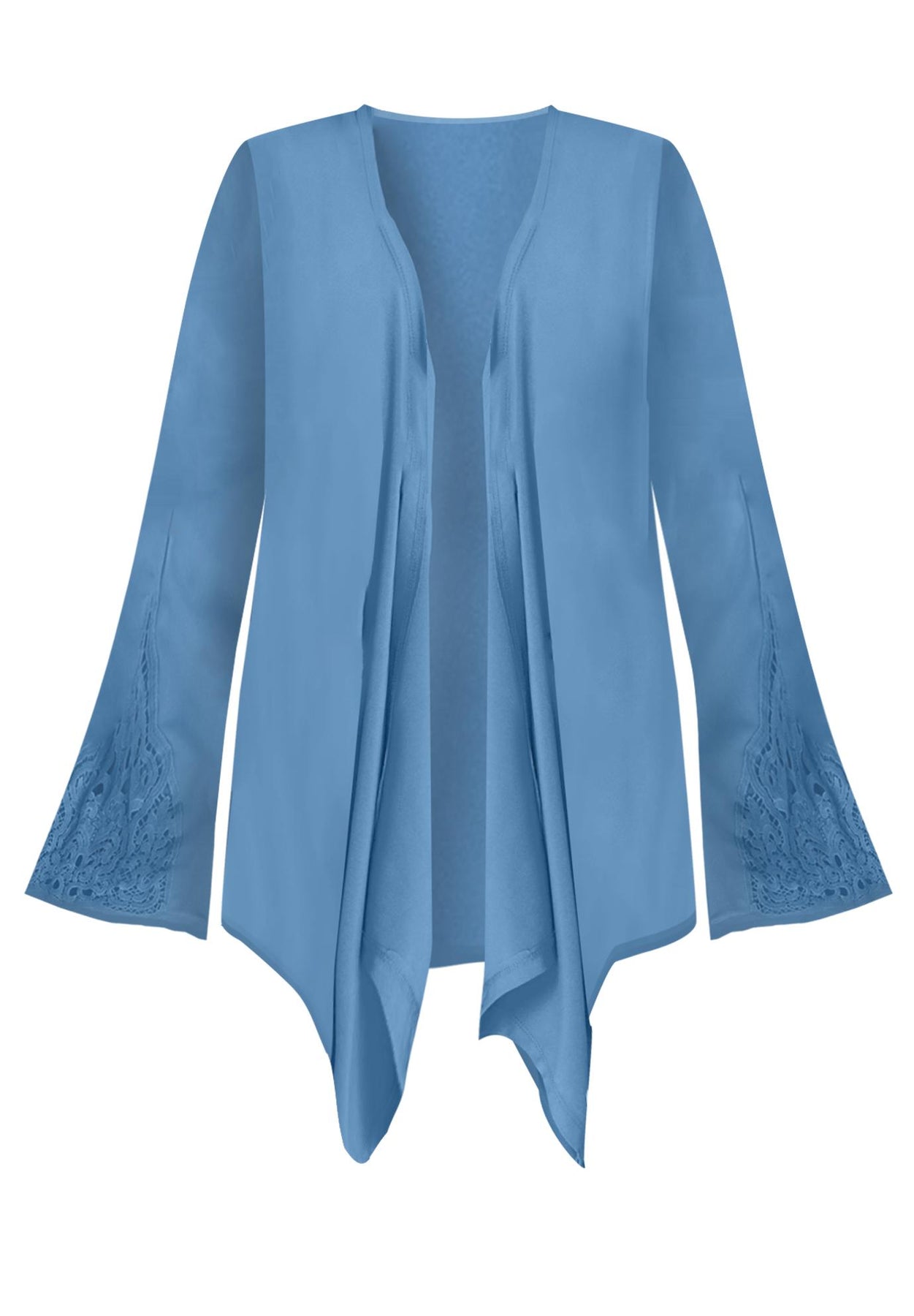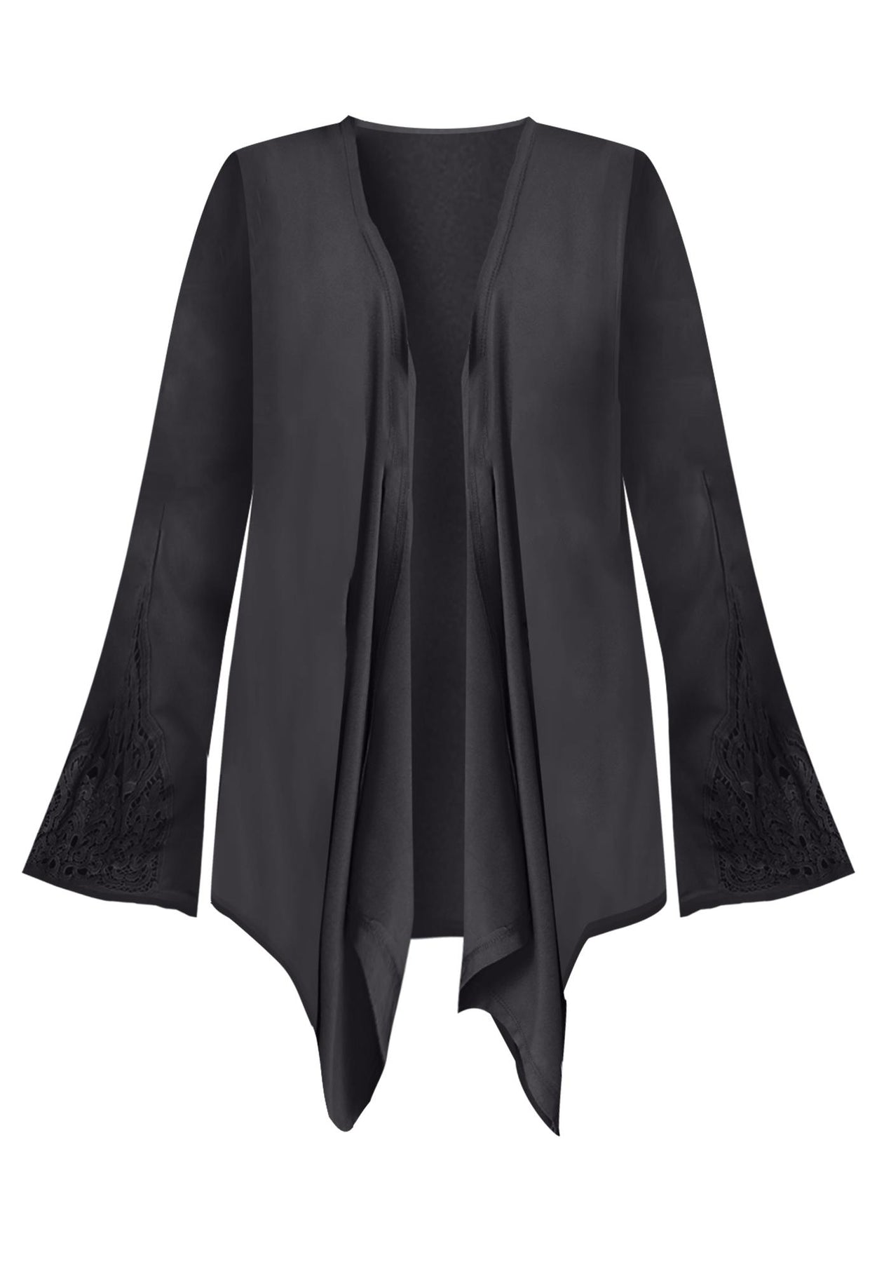 Keep your layering basics sleek and stylish with this open-front cardigan. Made from lightweight, silky fabric, it's defined by its lace bell sleeves and pointed hem. Style this cardigan over a tank and trousers or a sleeveless dress to bring instant polish and confidence to your day.