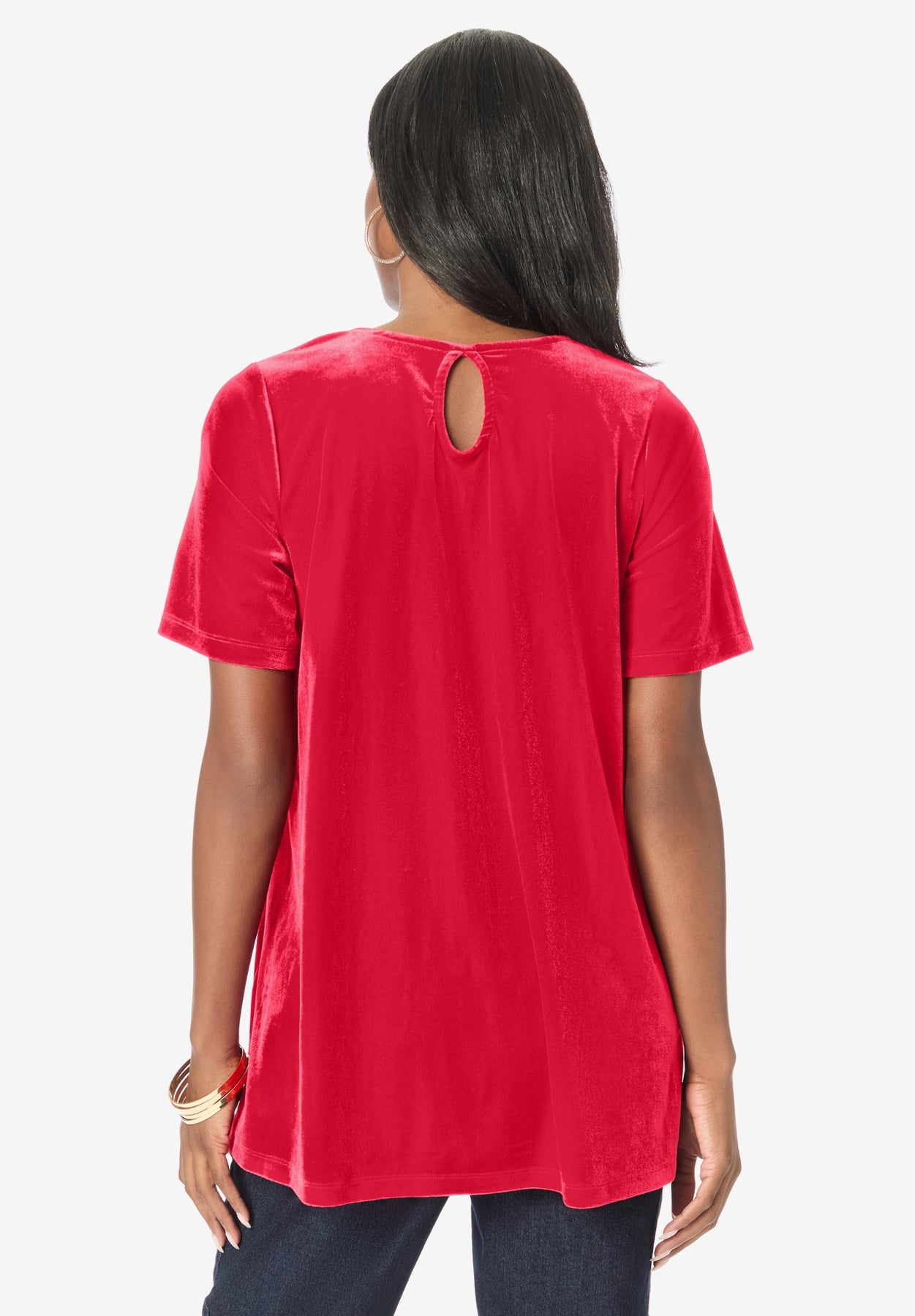 This style is part of our Swing Tee collection, featuring swing silhouettes that nicely drape over your curves and are comfortable to wear all day. A keyhole closure at the back of the neck offers a touch of convenience.