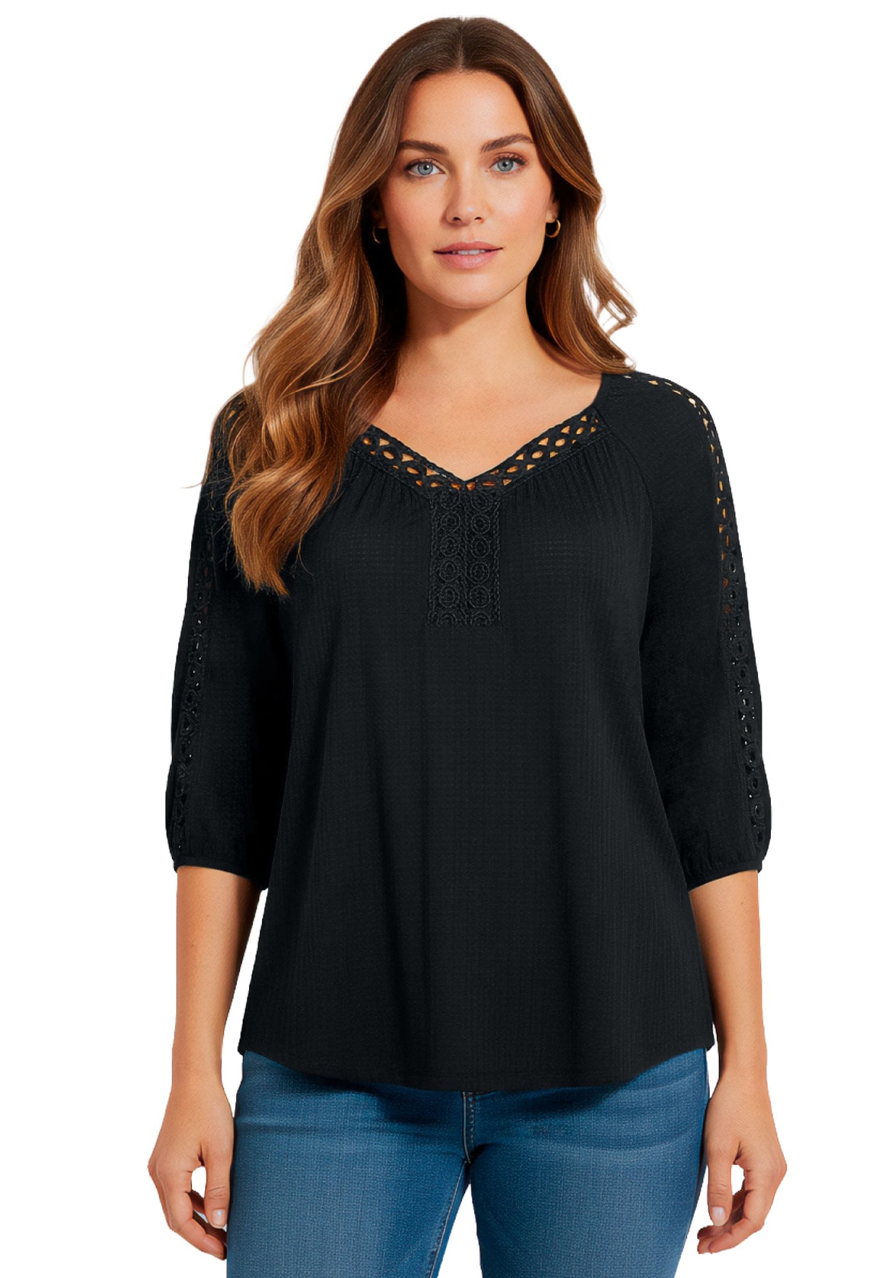Plus Size Lace Pointelle V-Neck Blouson Sleeve Tunic