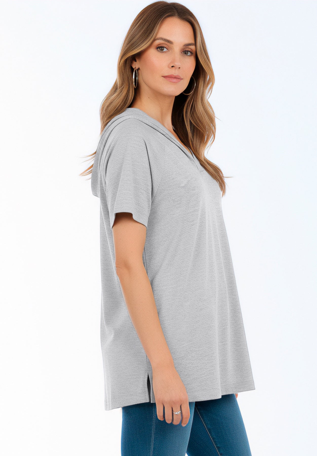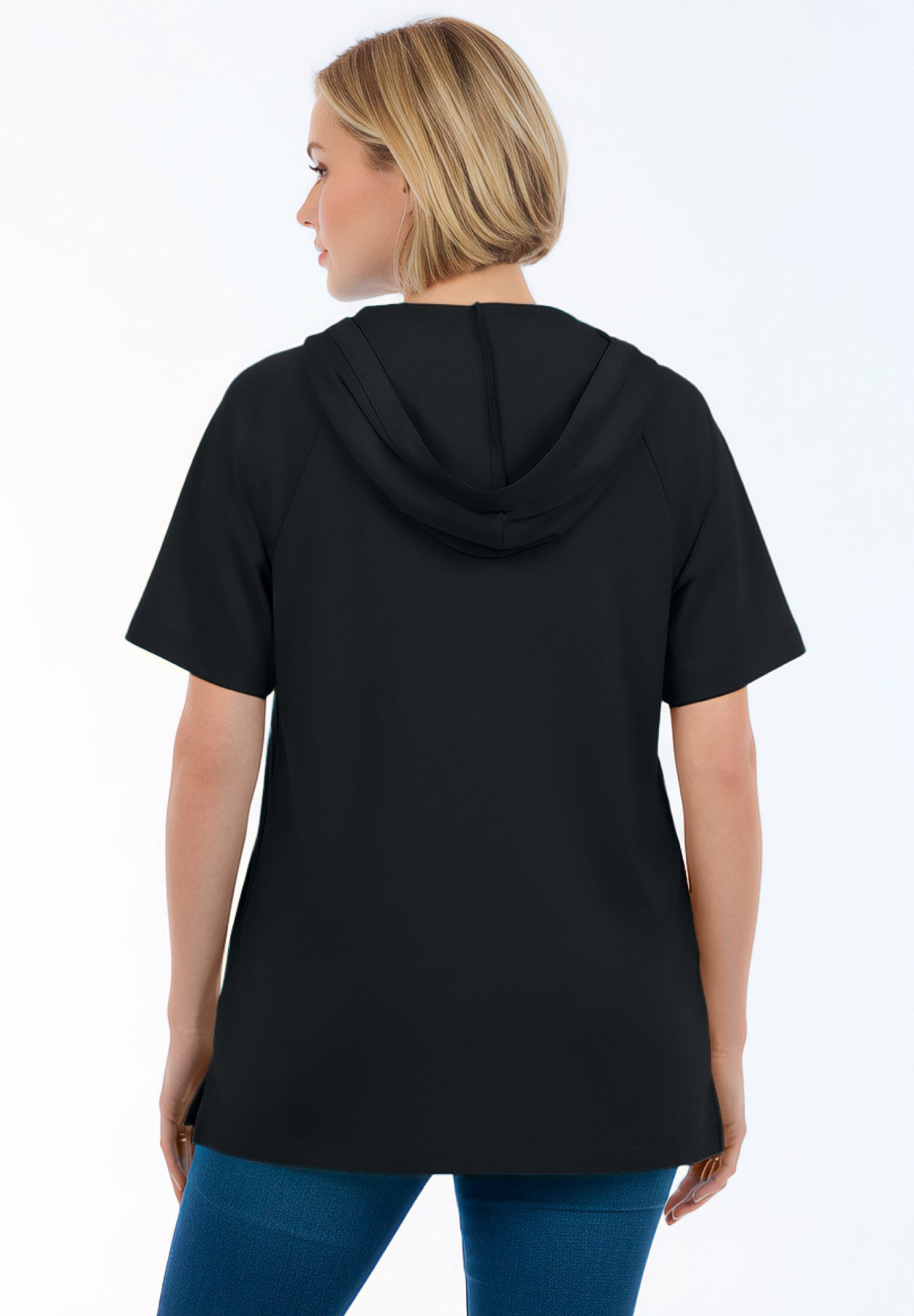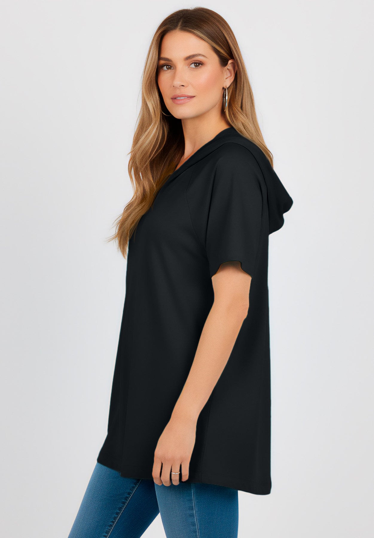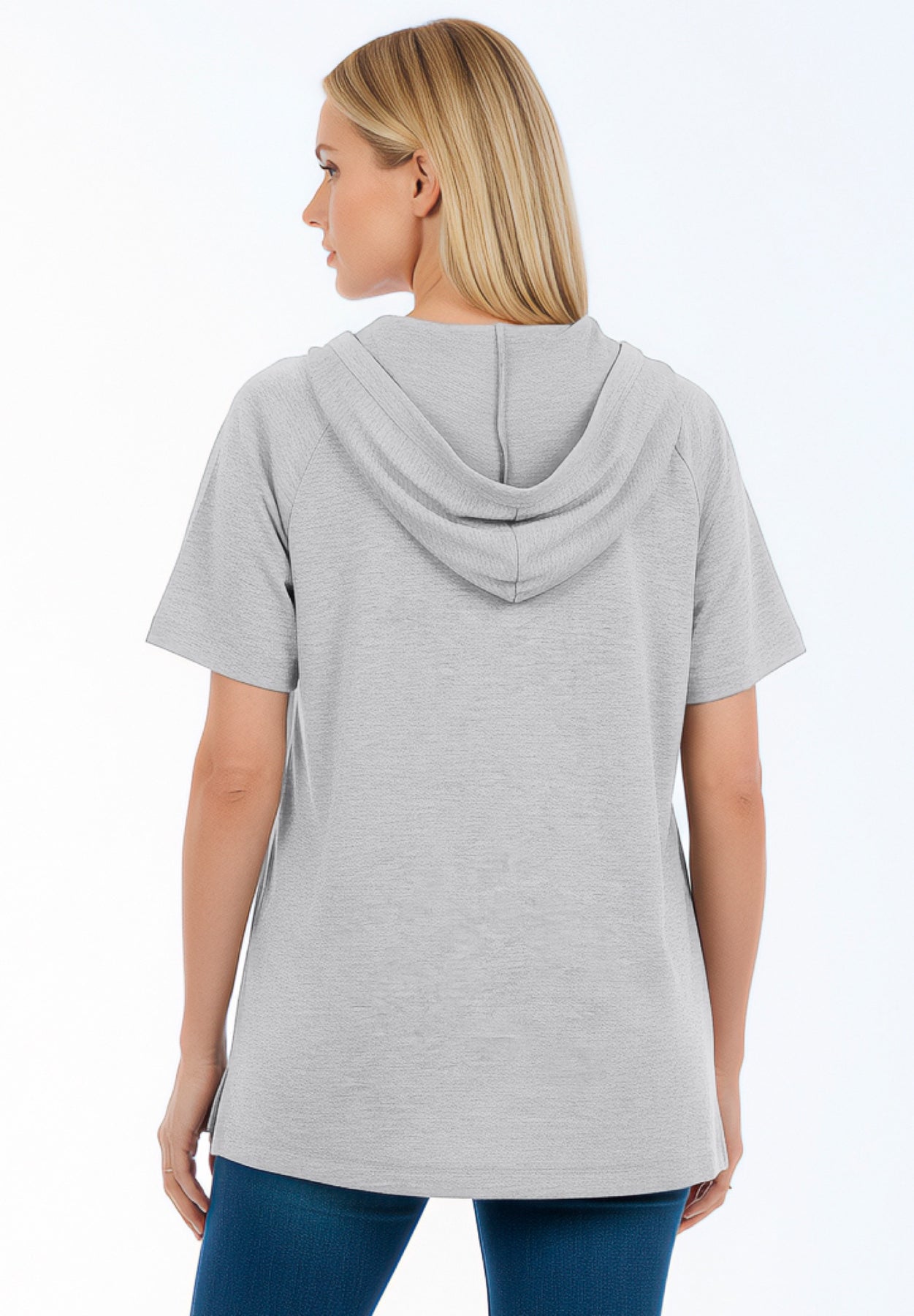 Cozy fleece meets elevated design in this V-neck hooded sweatshirt with raglan short sleeves, side slits, and metal-tipped drawcords. Soft, relaxed, and thoughtfully detailed, it proves comfort can still make a statement. Style it with joggers and sneakers for off-duty cool or layer over jeans and bold accessories for casual days done right.