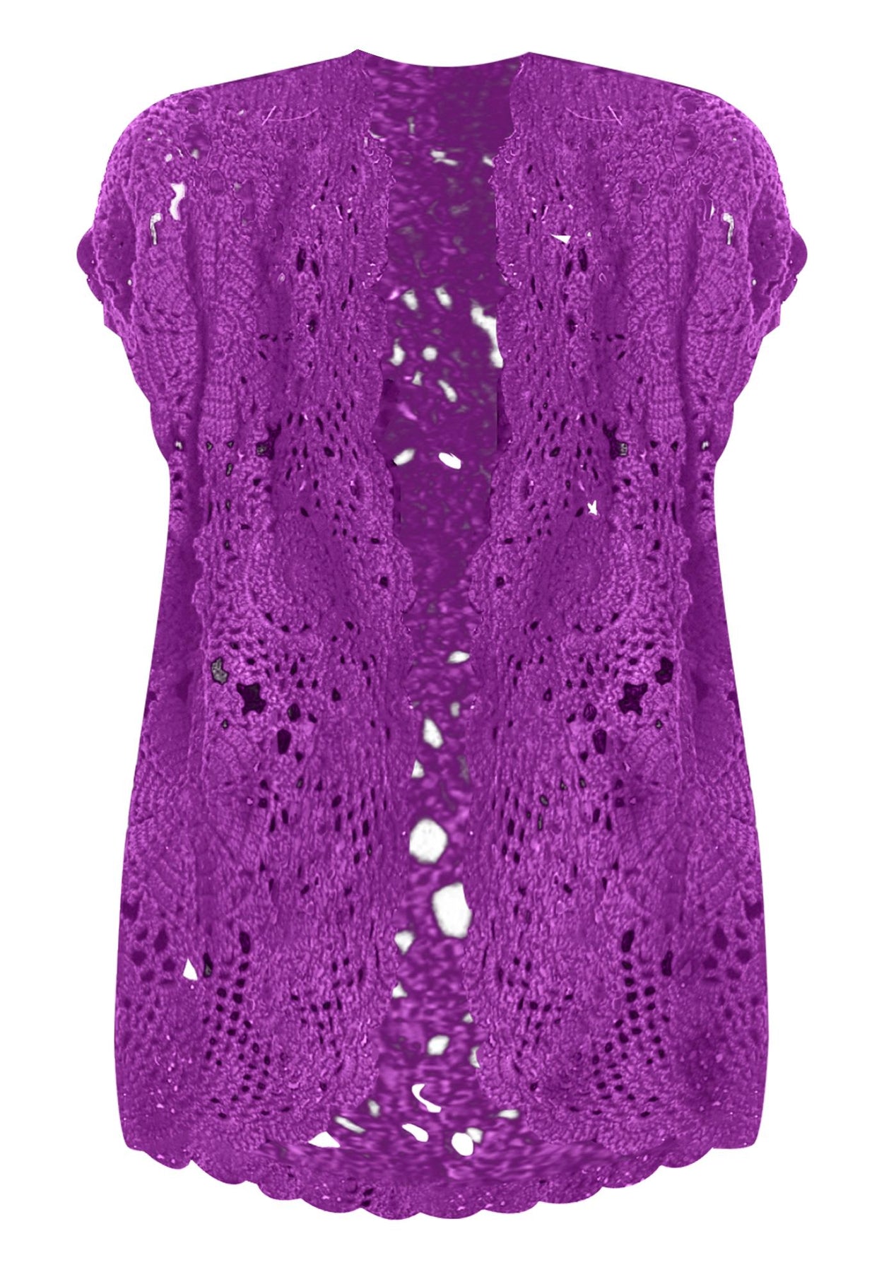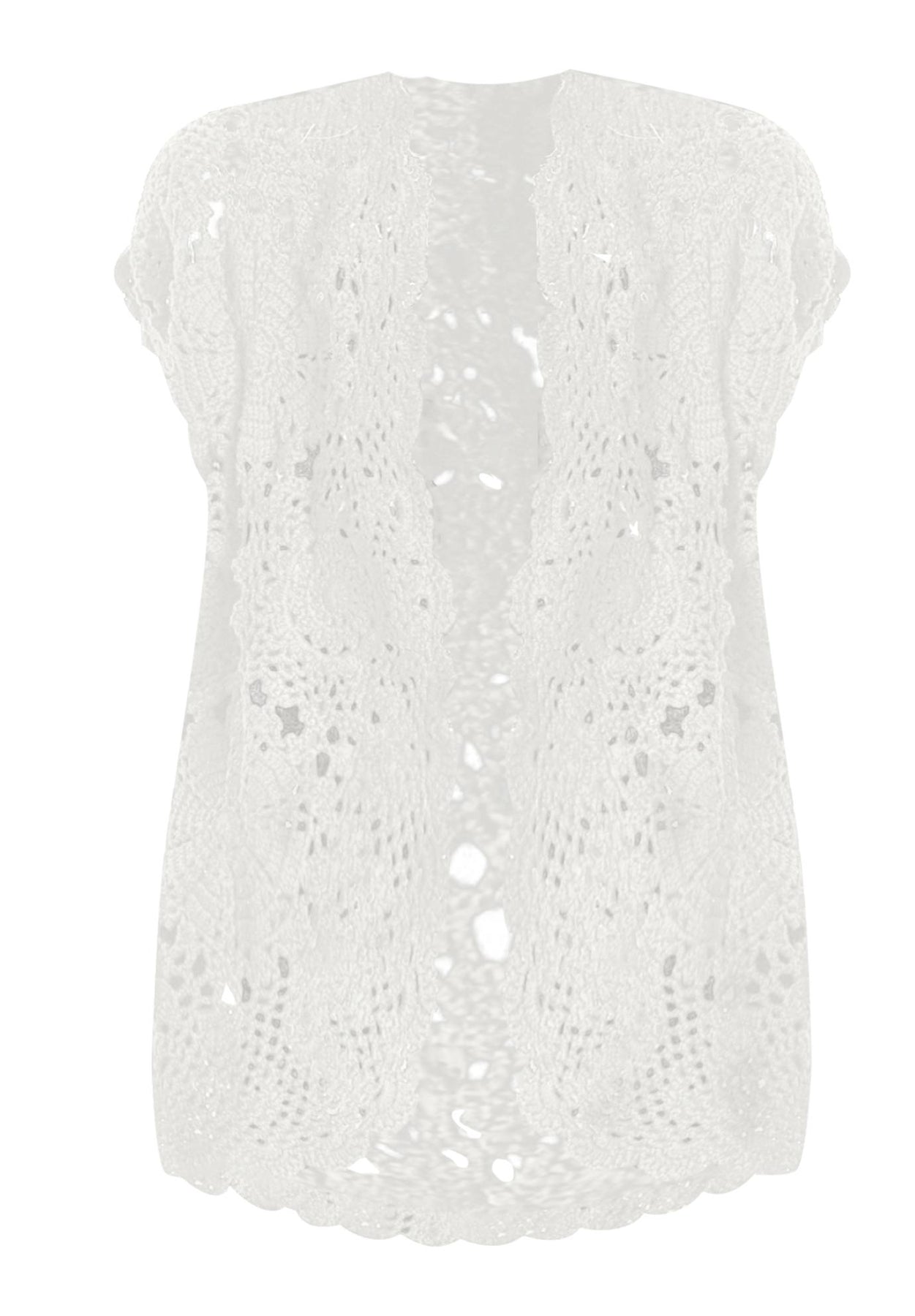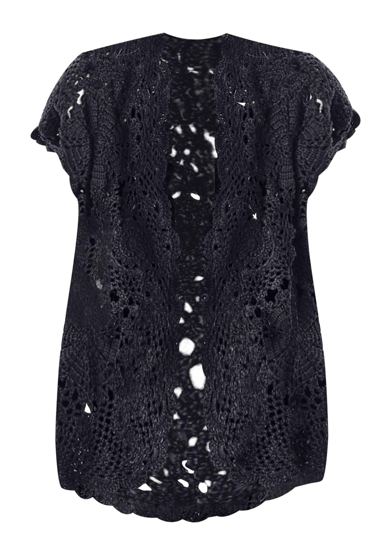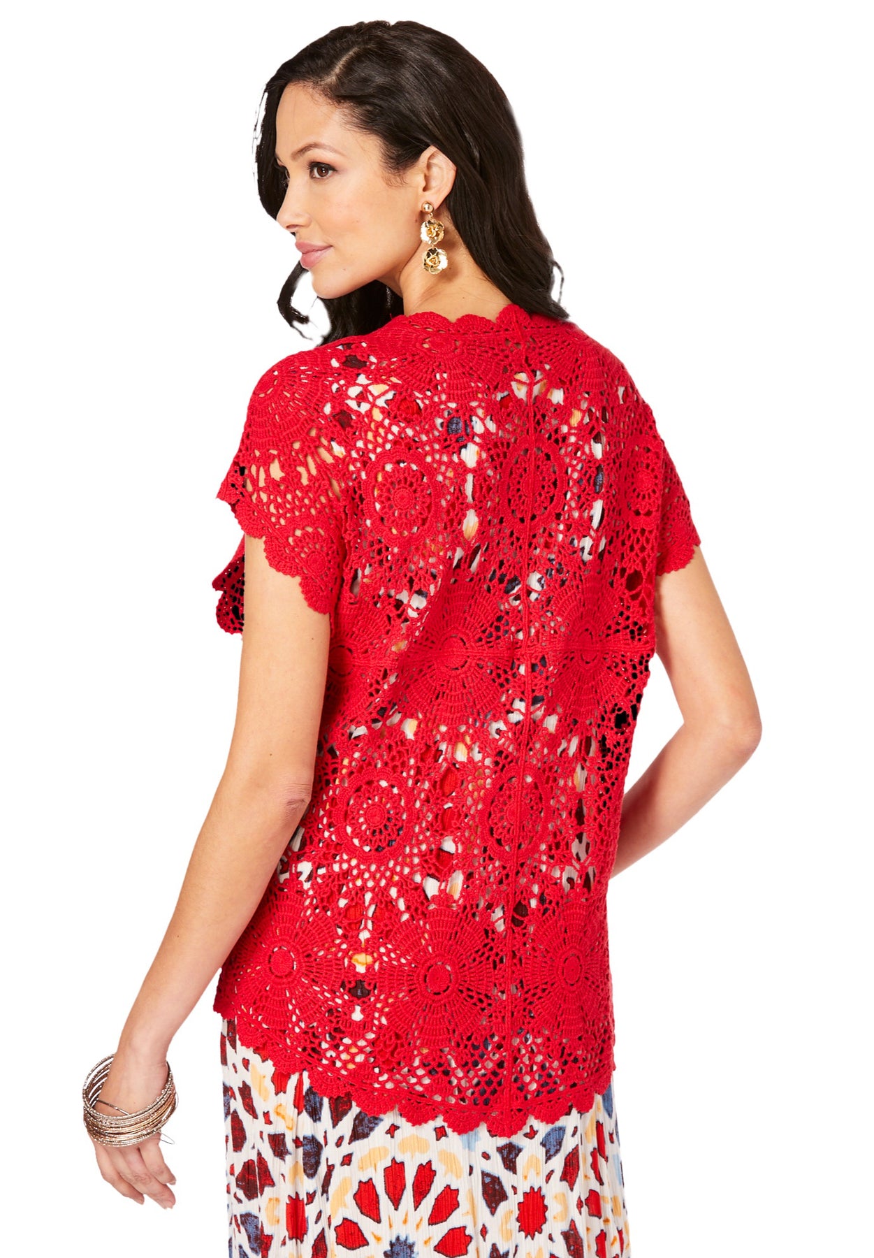 Layer on a lovely look with this beautiful sweater, detailed with a medallion design and pretty scalloped edges. The open front and short sleeves make it an easy topper to any outfit that needs a touch of romance.