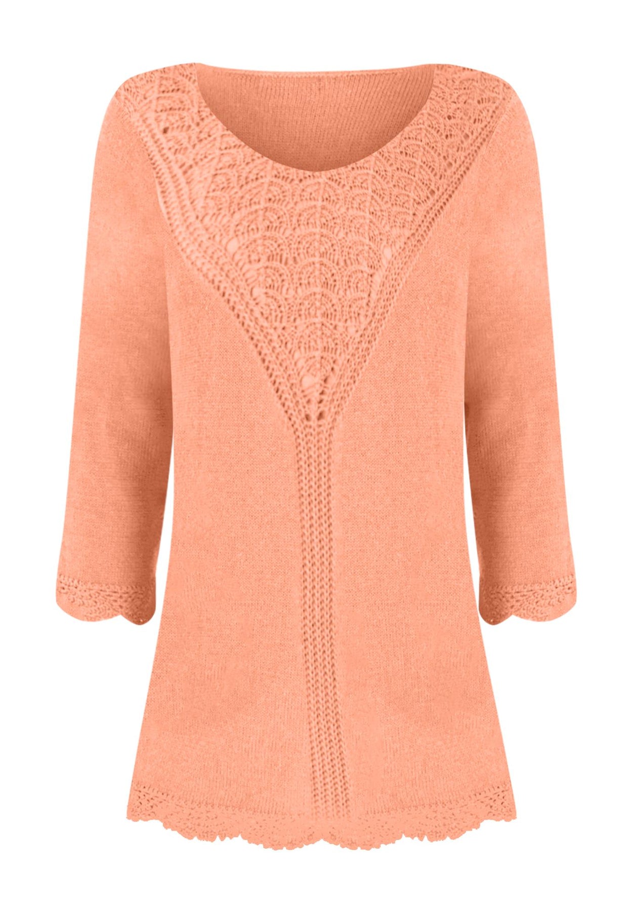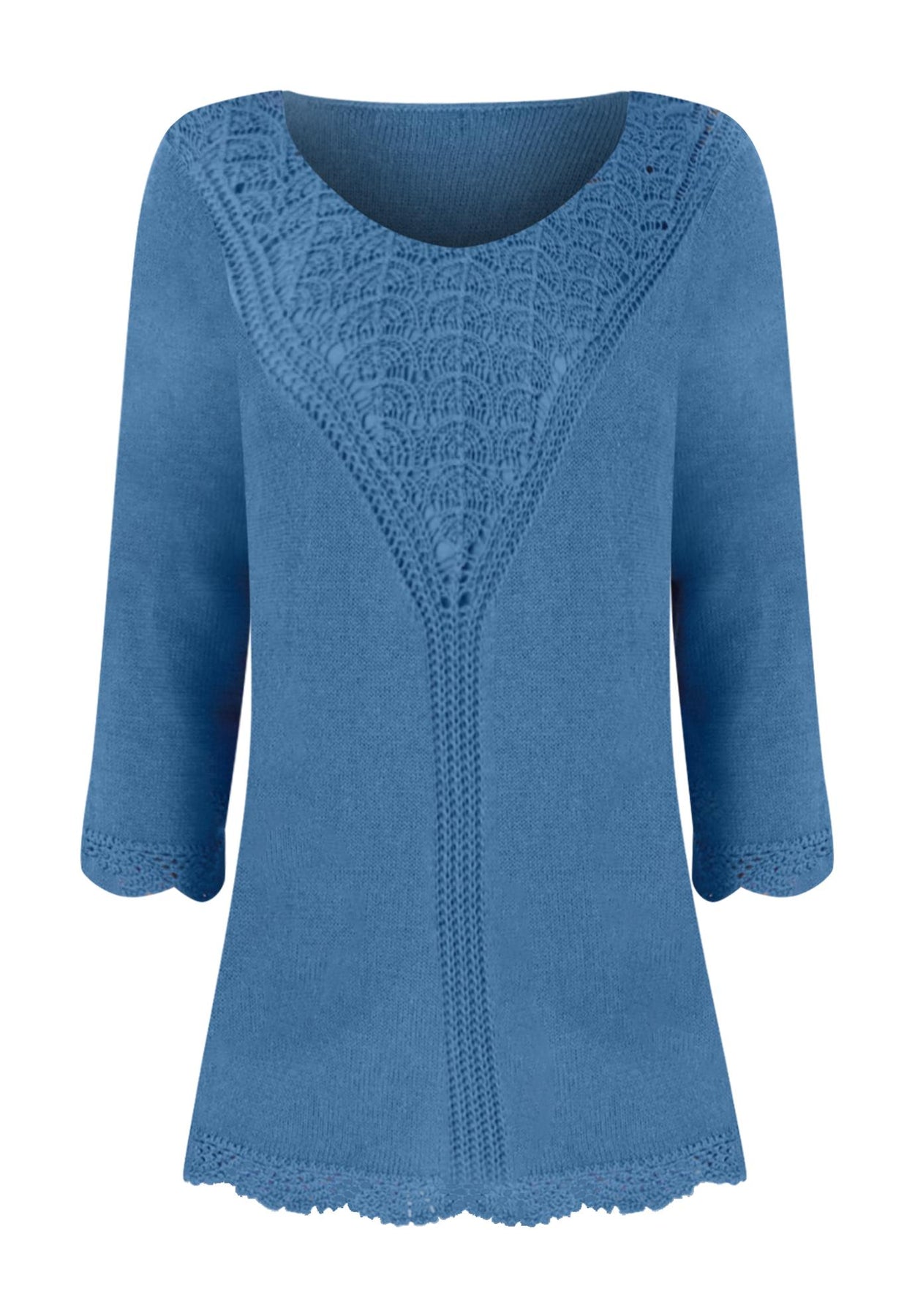 The intricately knit patterns at this lace pullover's boat neckline and sleeves catch the eye. This sweater is made from a ramie-cotton blend fabric, which adds a touch of silky luster and reduces wrinkling. Its seven-gauge knit makes for a lighter-weight pullover that's perfect for the weekend. Three-quarter sleeves.