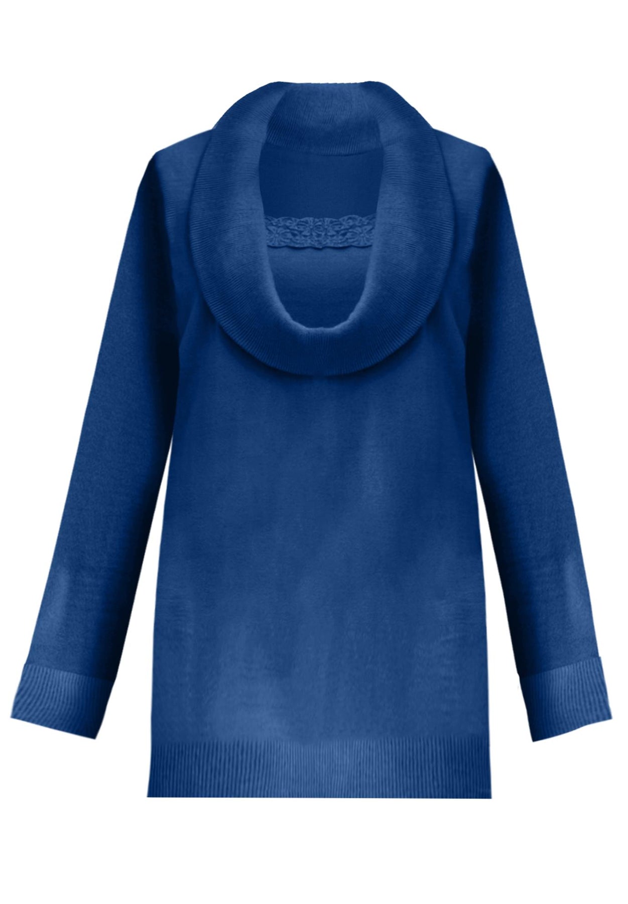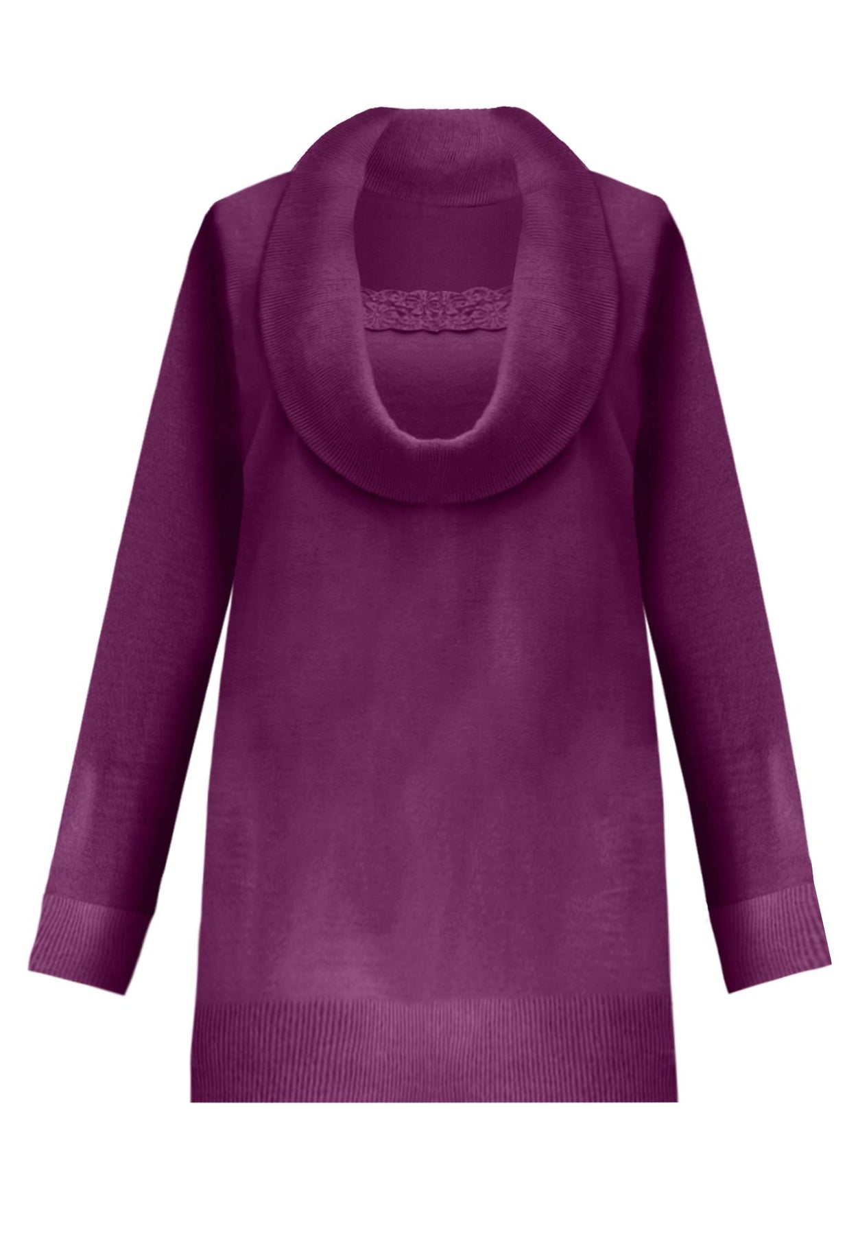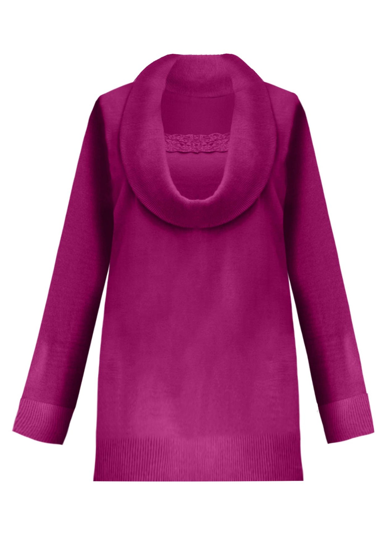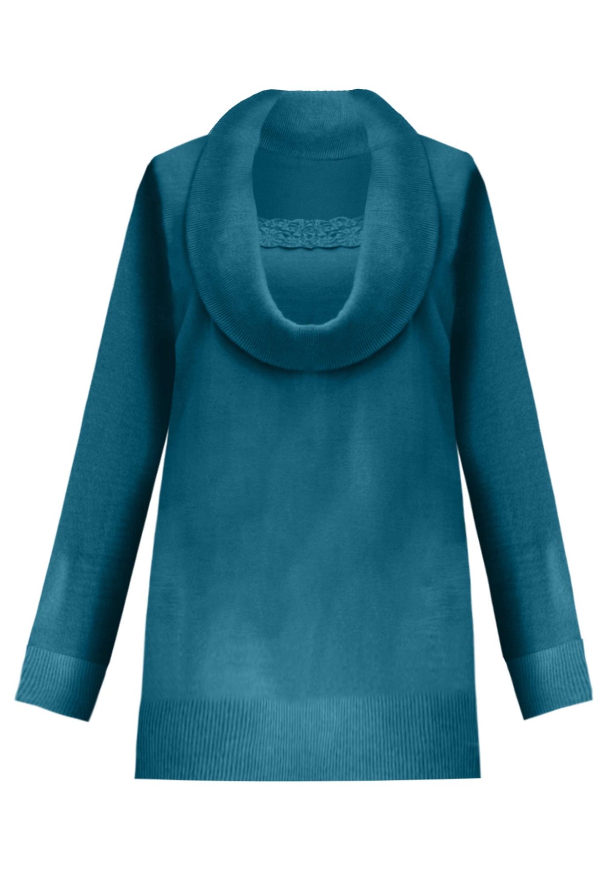 This elegant sweater was made to flatter you flawlessly. It's detailed with a lace trim inset, and the cowl neck gives you that cozy-chic feeling you won't want to live without.
