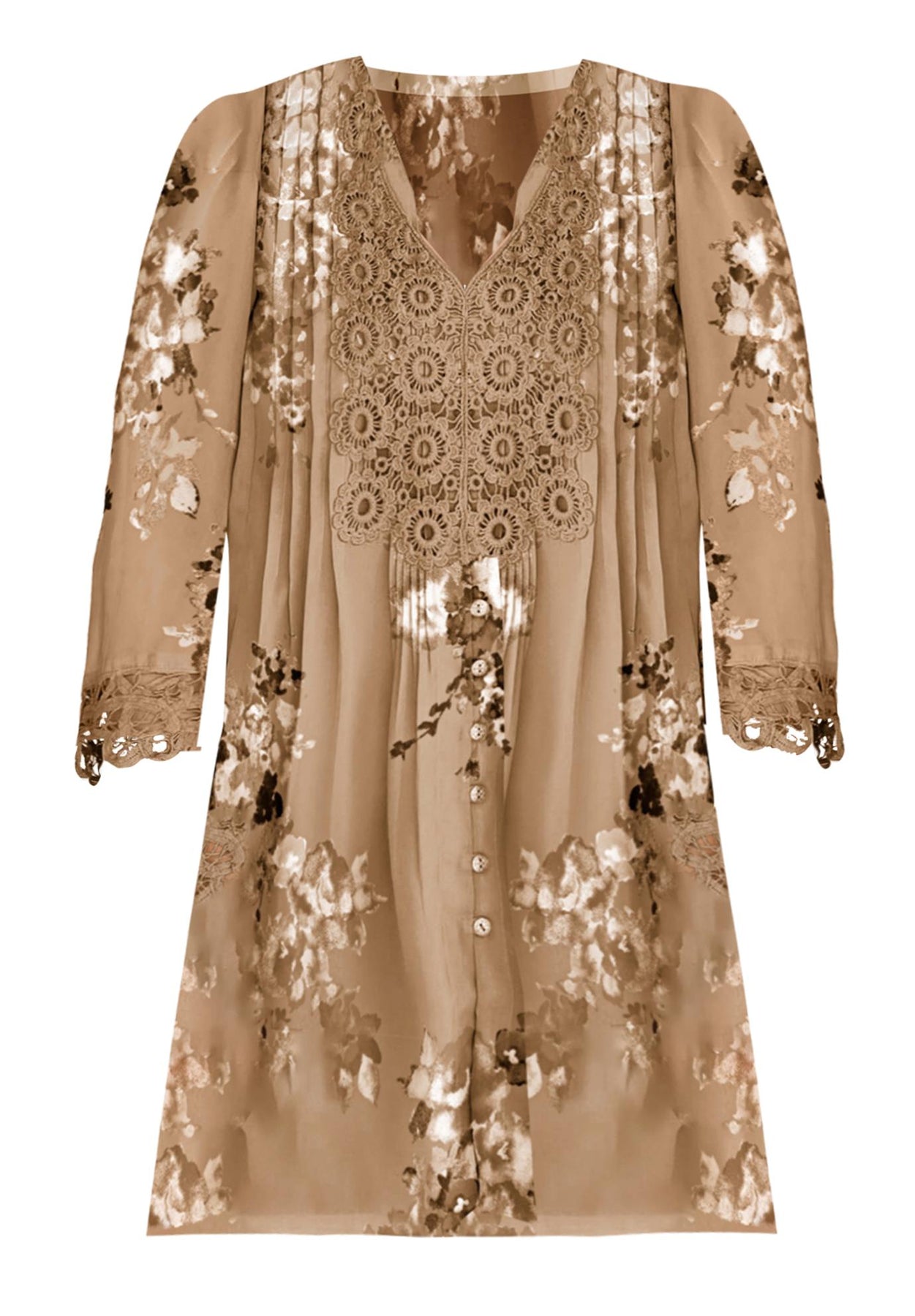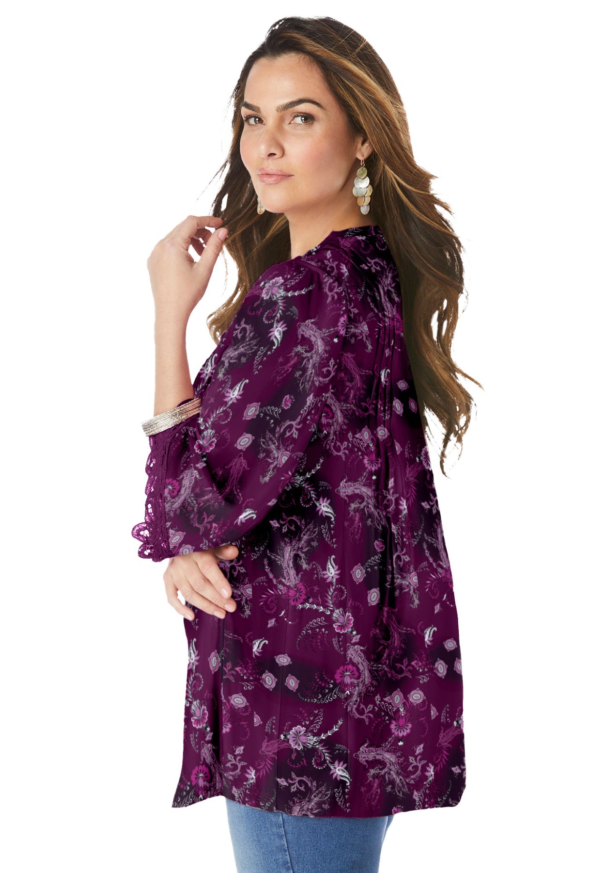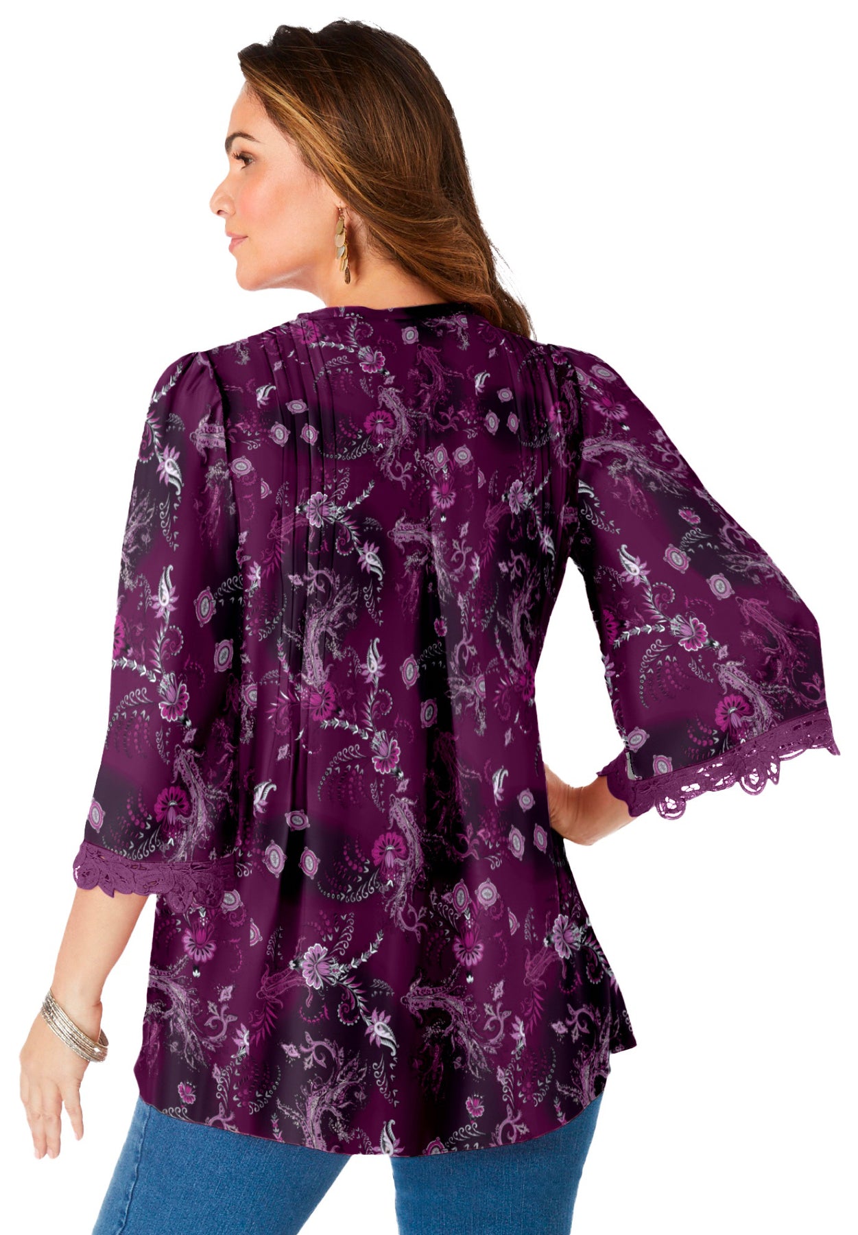 Hit all of the major style trends with this delicate style featuring an intricate lace-bib front, lace-detailed three-quarter sleeves, a pleated front and back, and an elbow sleeve feminine, flowy & flattering.