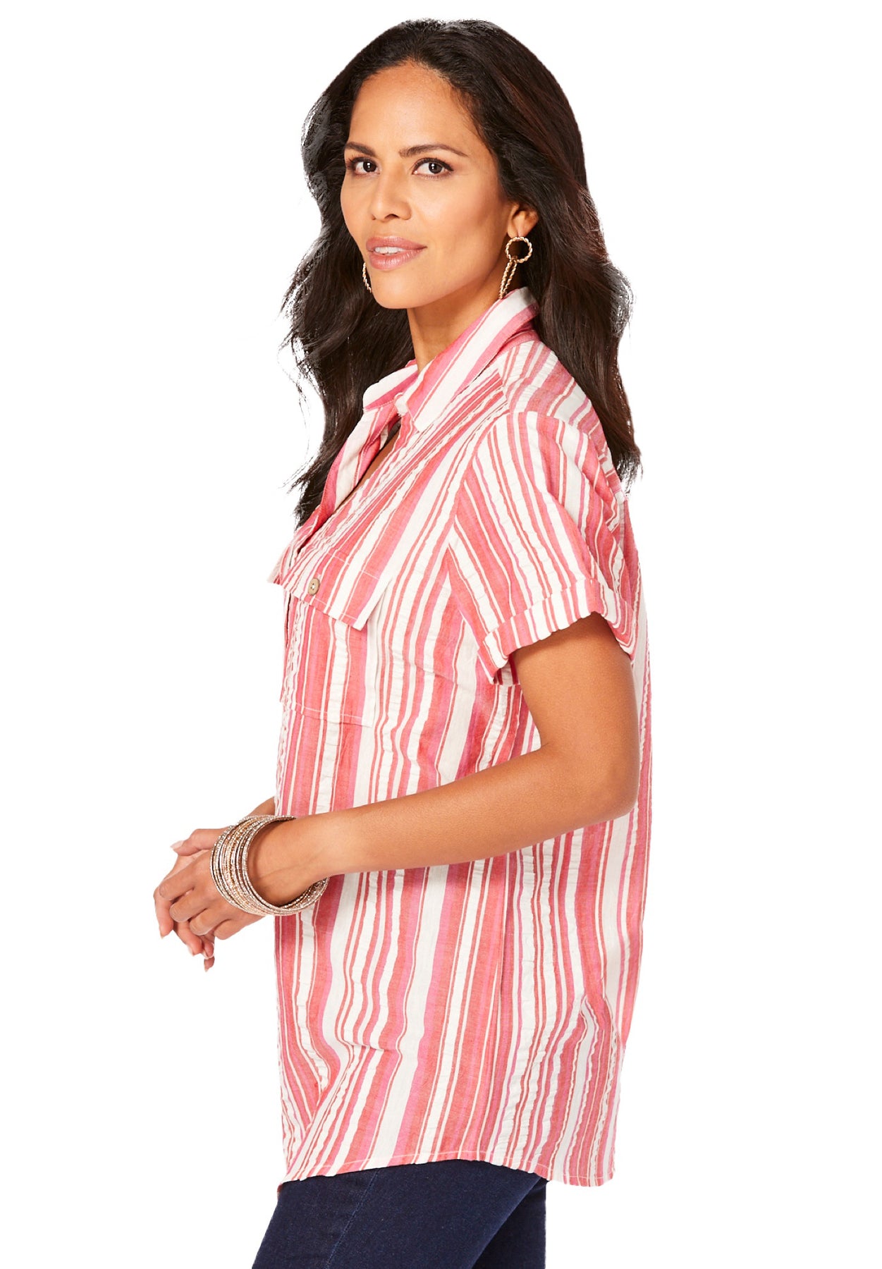 This classic button-front style gets a fresh upgrade. Now in an even softer fabric, it’s a closet staple that makes a timeless impact. Two chest pockets, cuffed sleeves and shirttail hem. Complete your look with jeans or shorts.