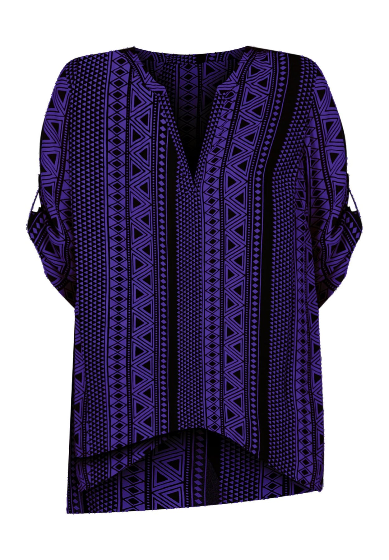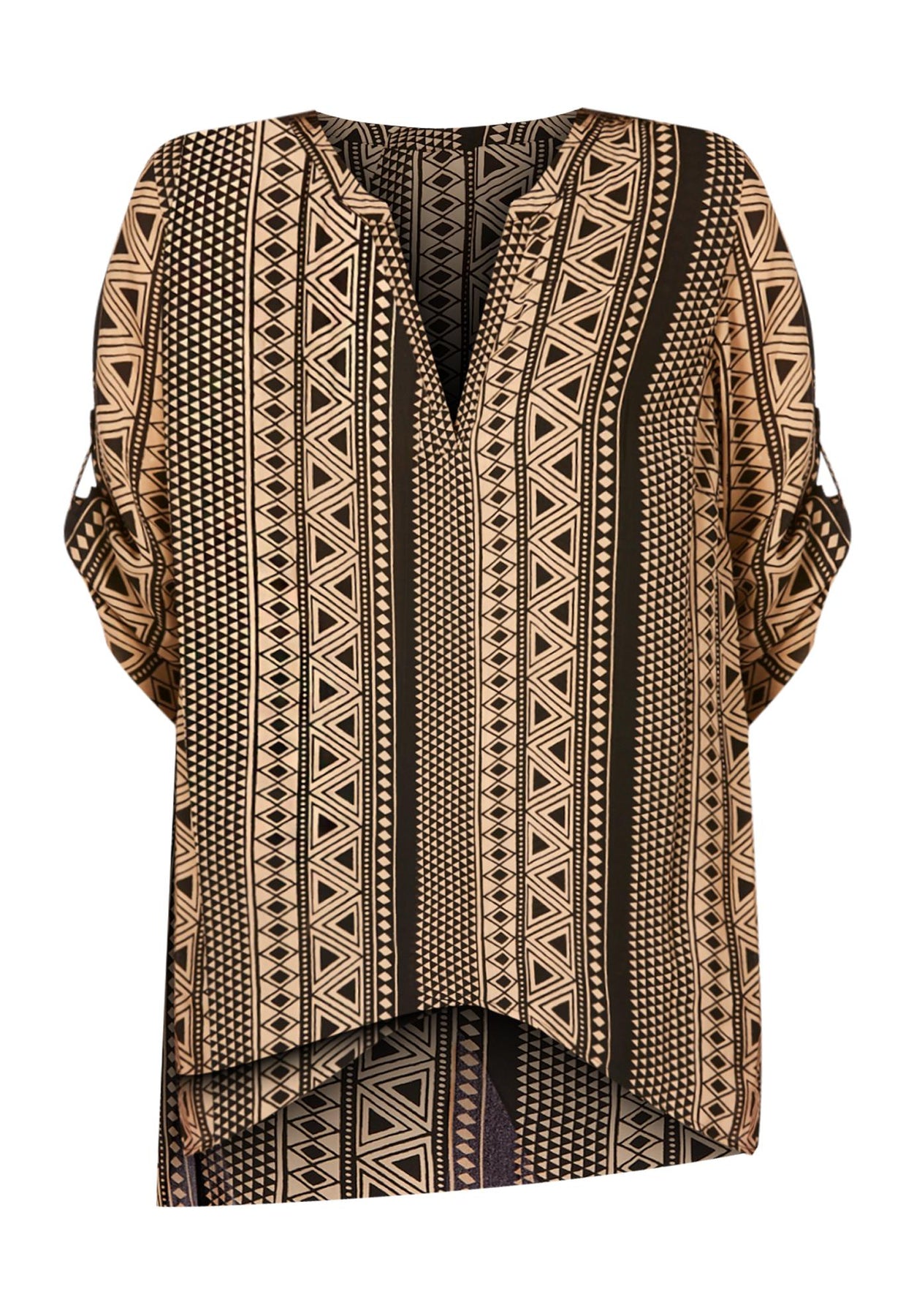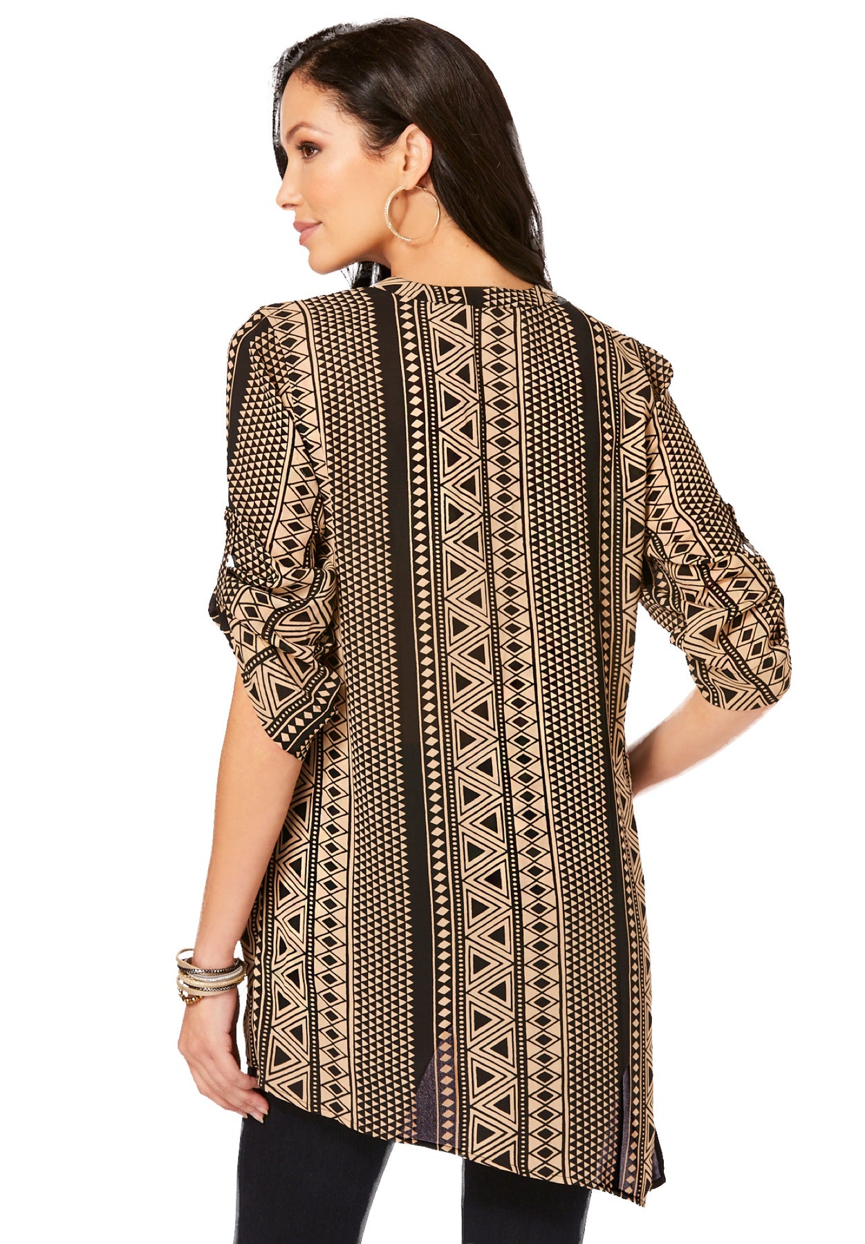 The modern geometric print takes this flowy tunic from simple to stunning with a split neckline and an asymmetrical crossover bottom hem. Three-quarter roll-tab sleeves, a-line silhouette.