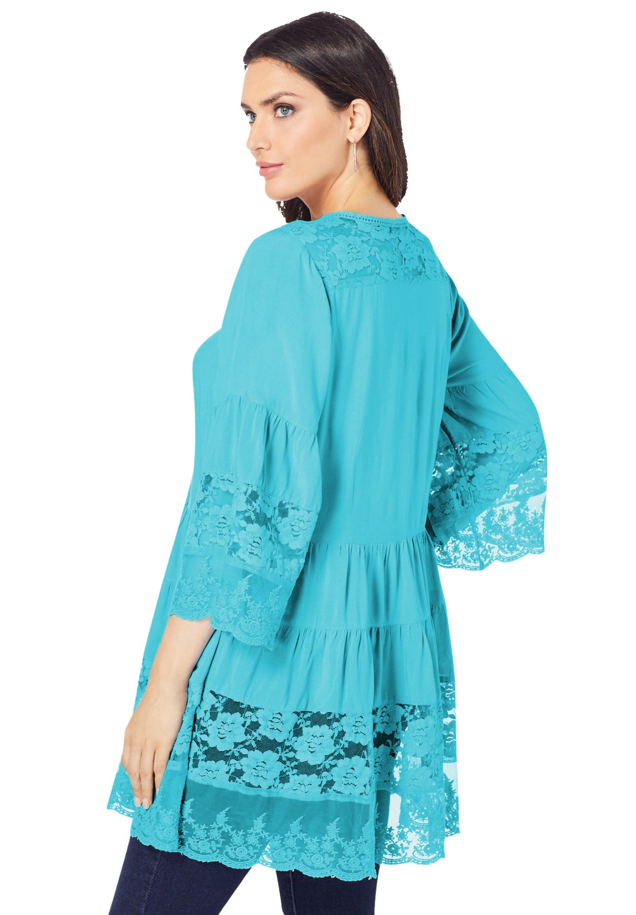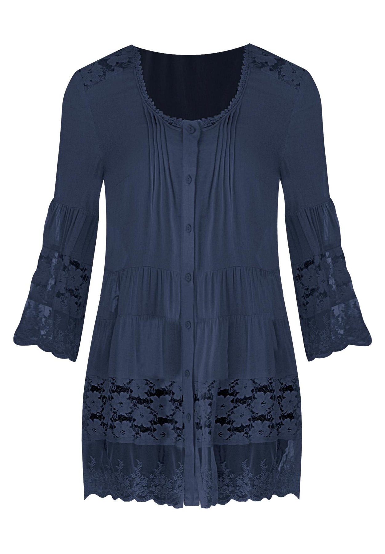 One of our most feminine tops, this beautiful tunic goes great with a pair of jeans for a weekend getaway or with leggings for girls' night out. Tiered button down. Three-quarter bell sleeves.