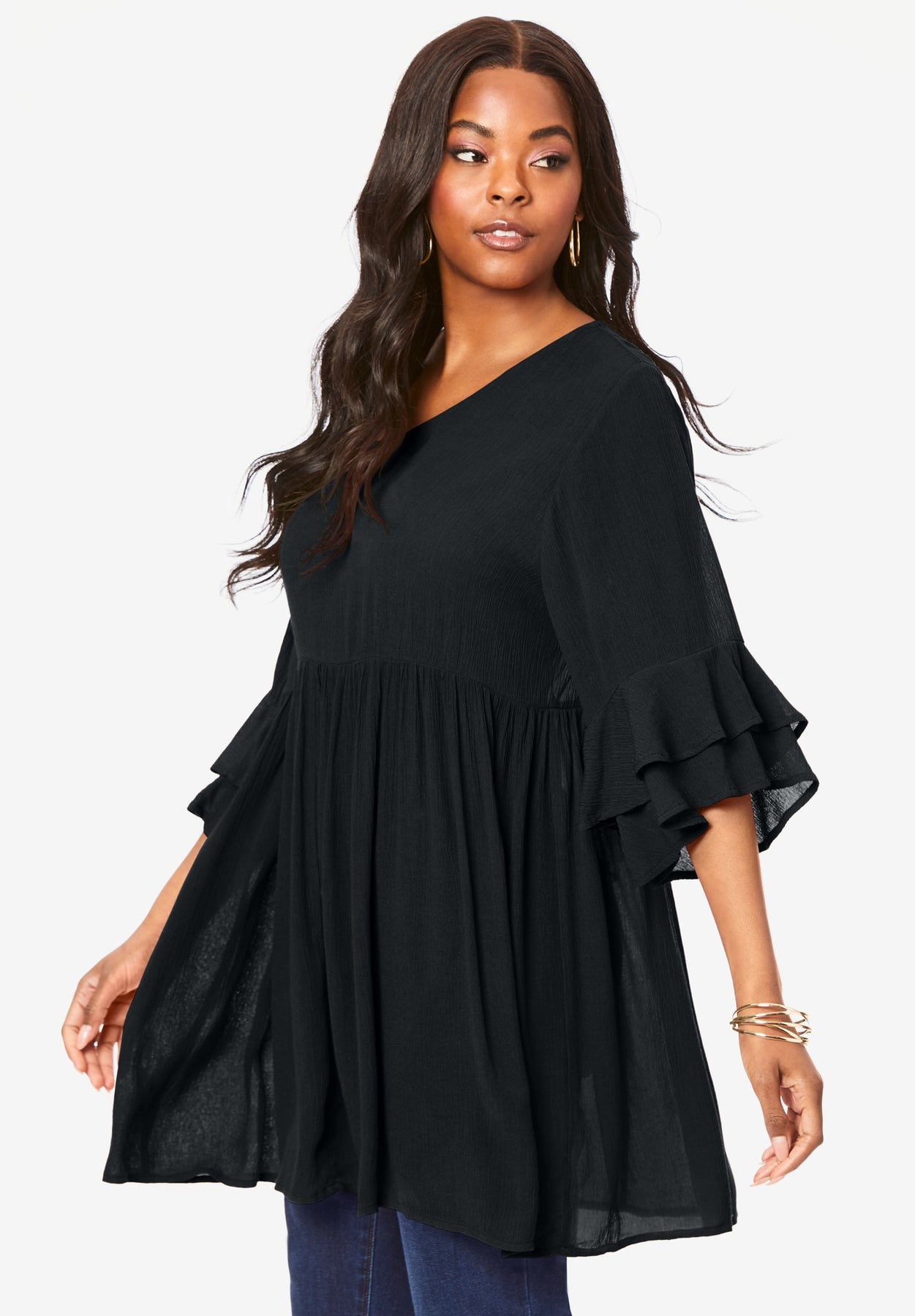 Cut in easy, breezy crinkle crepe, this flutter sleeve tunic with an empire waist is flattering, fashionable and oh-so-comfortable. Pair it with denim, throw on a long necklace and you're set to make heads turn.