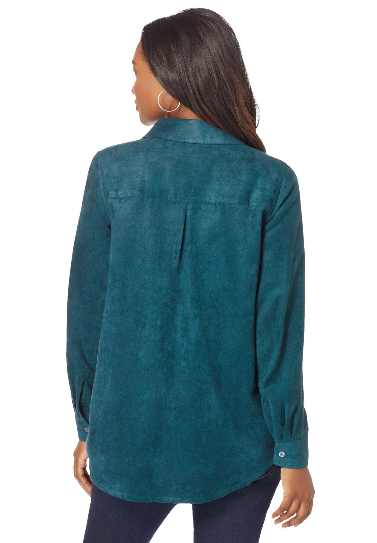 What makes this shirt great is how smooth and easy the faux suede fabric is. Perfect for layering over a tee or tank on chilly days. Button up in a classic shirt with the look and feel of suede. Long sleeves with adjustable button cuffs. A-line silhouette.